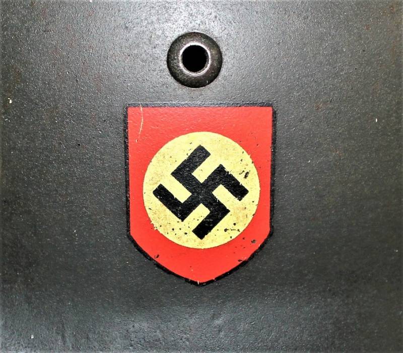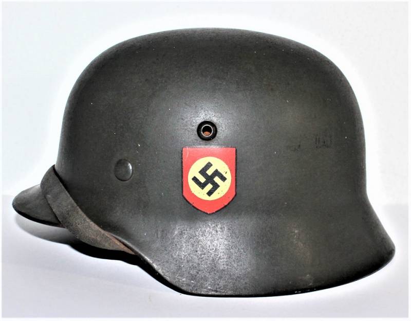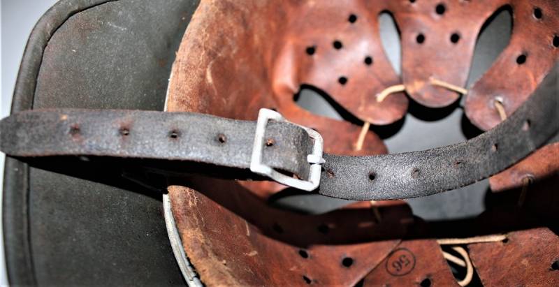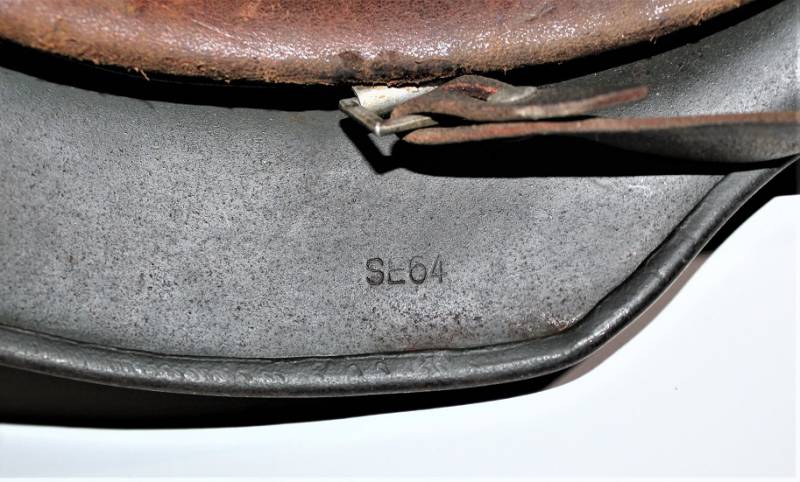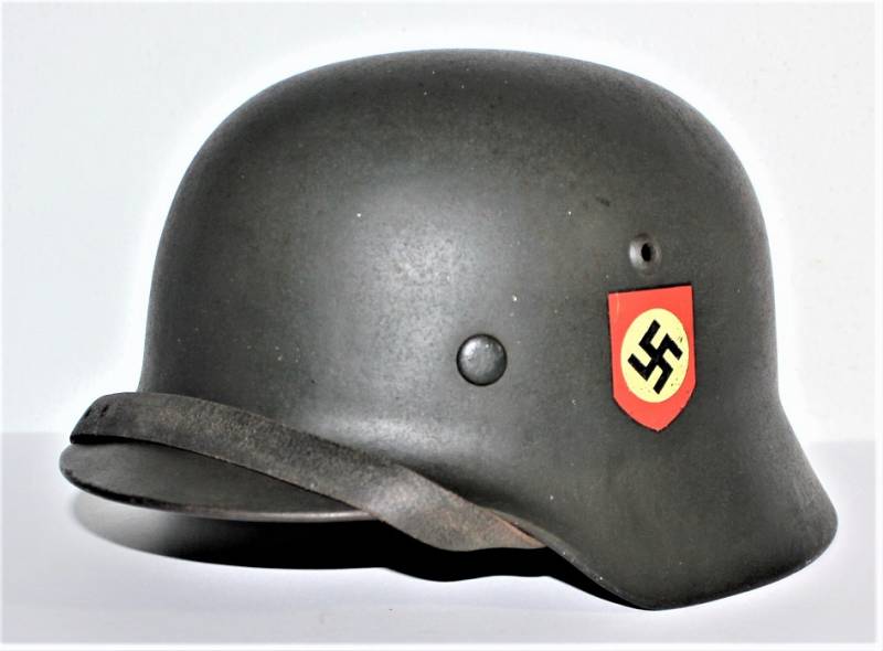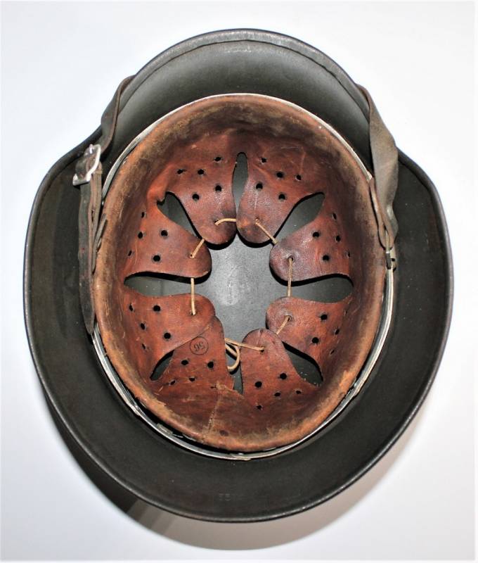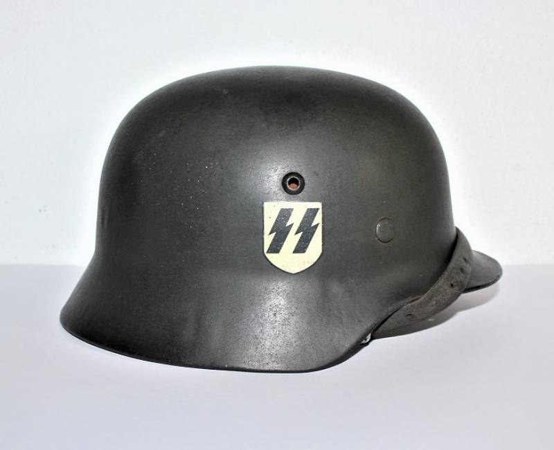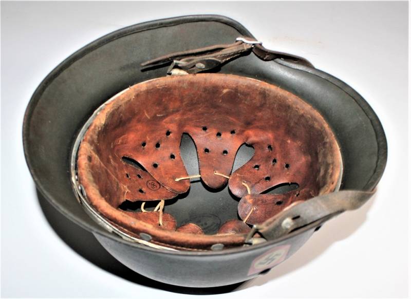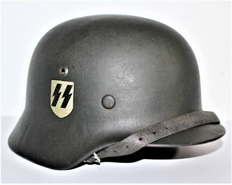 Superb helmet M35 W.SS doubledecal in perfect condition, complete in all its parts, not restored or repaired, only with slight patina of time and use, born in almost 100% gray-green paint, slightly patinated decals, but also almost 100%, liner and chinstrap never disassembled, chinstrap marked with manufacturer and dated 1939, marked on the iron with the manufacturer´s oval stamp and date 1939, iron marked with lot number, manufacturer code SE64, leather size 56. Original 100% WWII period and very rare.