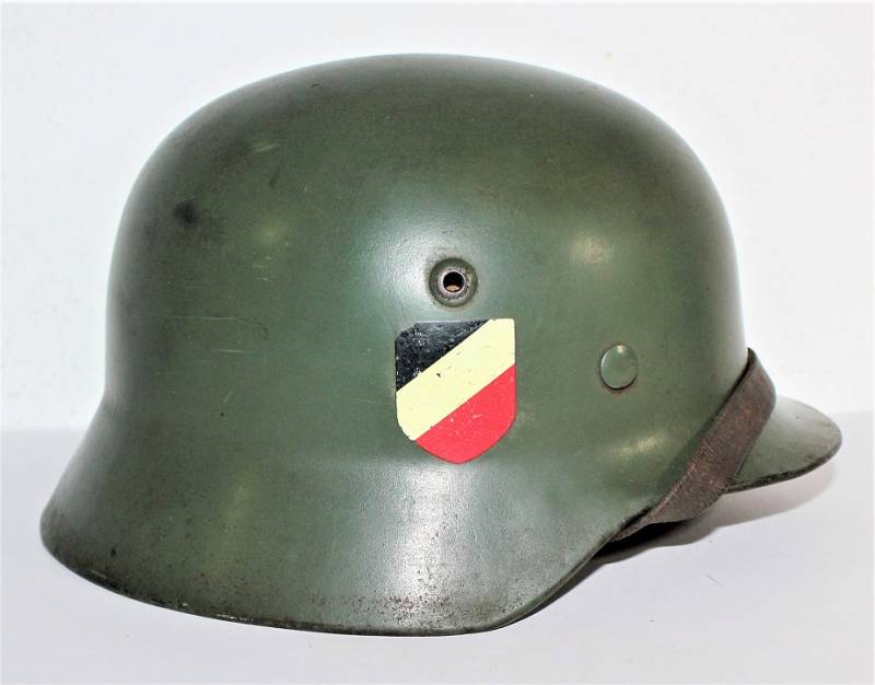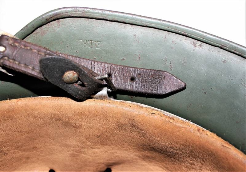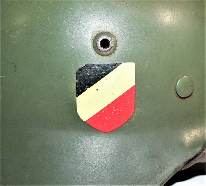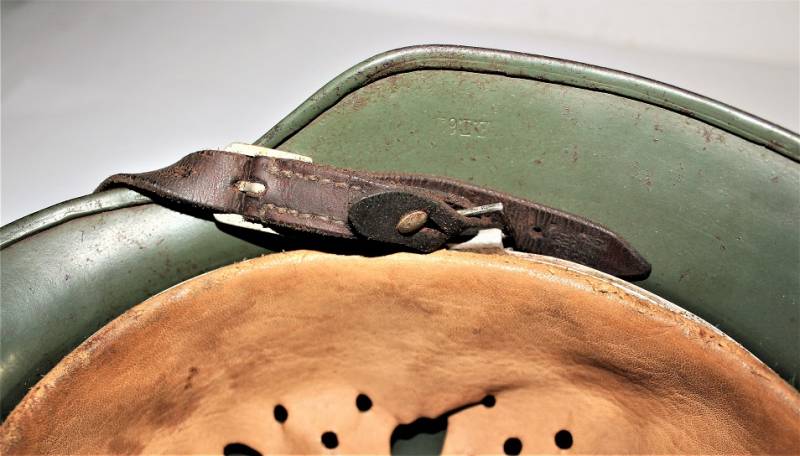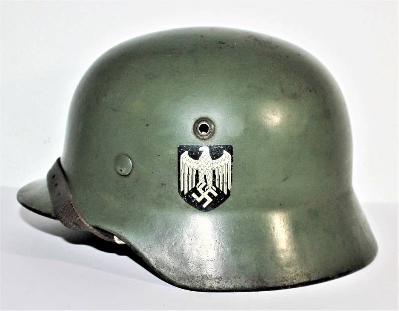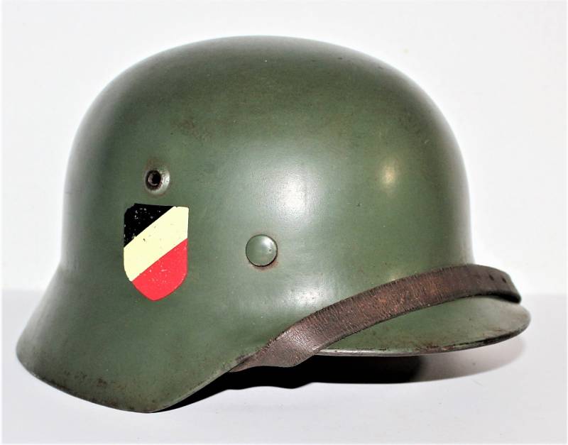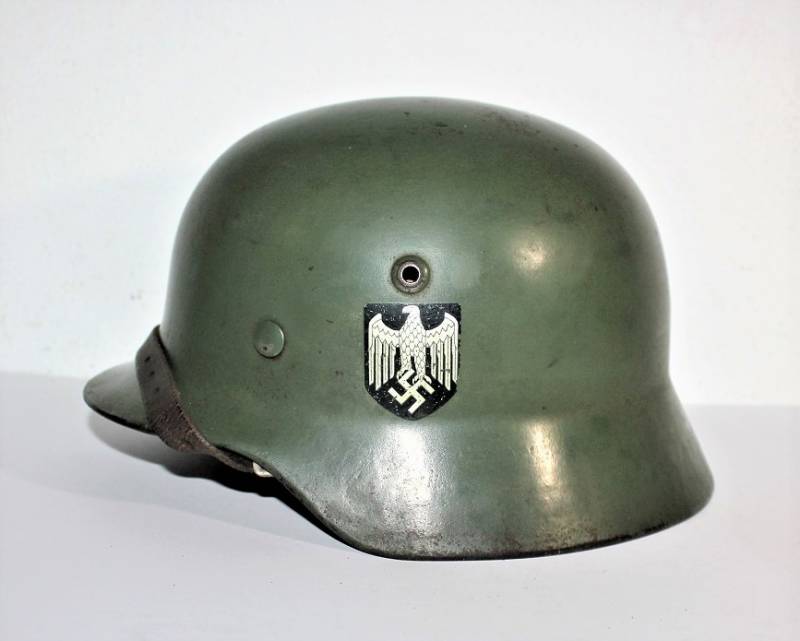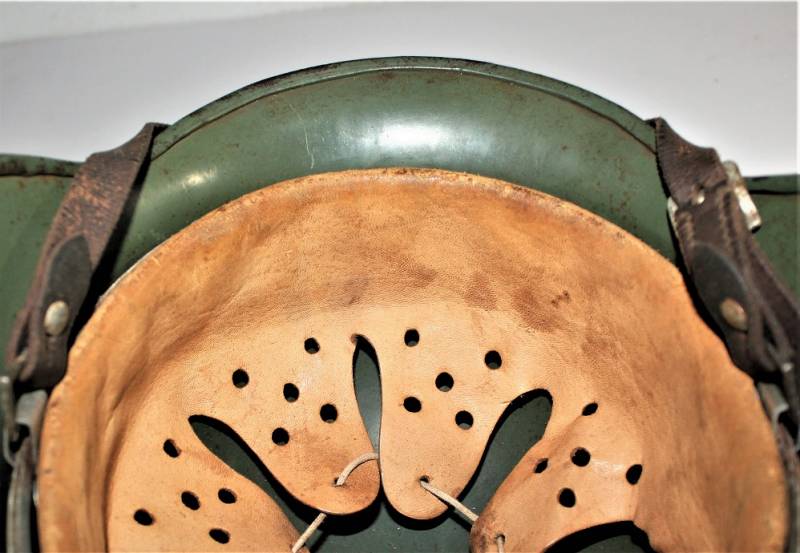 Superb M35 helmet duble dekal of the WH born in apple green color 1st type at 95%, excellent condition only light patina of time and use, not restored or repaired, complete in all its parts, interior and chinstrap never disassembled, leather in excellent condition not damaged, only patinated from use, chinstrap marked with manufacturer and date 1939, decals in excellent condition near 100% eagle and national color also only patinated by time. Inside the helmet on the cap clearly visible oval acceptance stamp dated 1939, iron marked with manufacturer code ET62 and lot number, leather size 56. 100% original WWII period and very very rare!!!