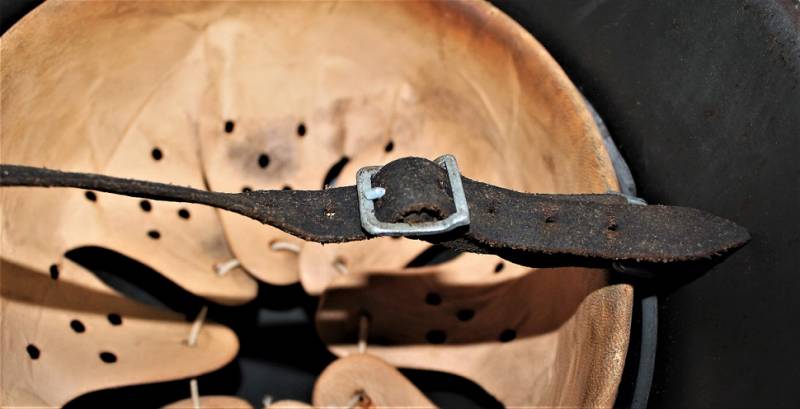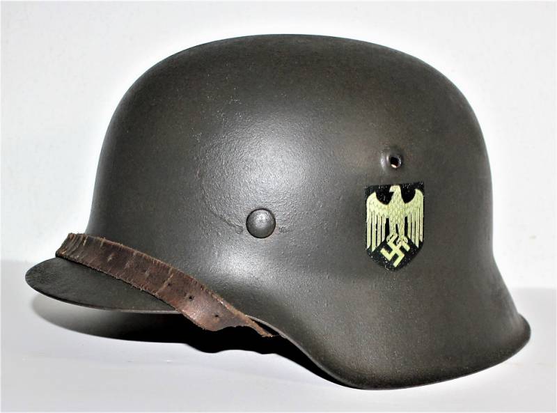 Beautiful M42 monodekal helmet in perfect condition almost like new, used very little only with a slight patina of time and use, complete in all its parts, liner and chinstrap never disassembled, born in 98% wrinkled dark feldgrau color, decal almost to the 100% only slightly patina of the time, iron marked with manufacturer code size 66, leather size 58, chinstrap marked with manufacturer code and date 1943.