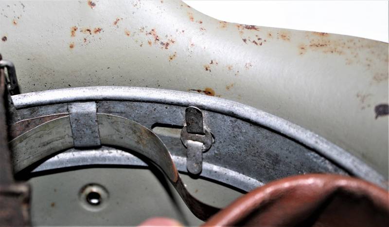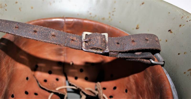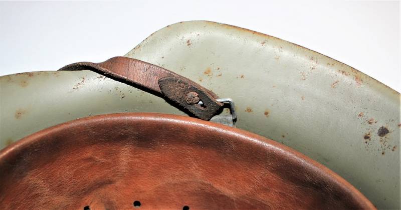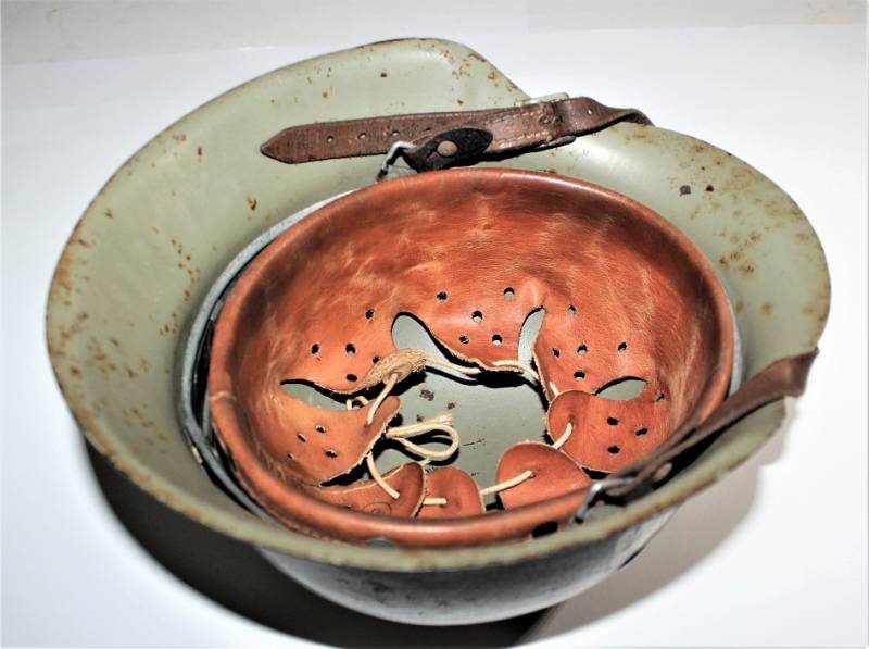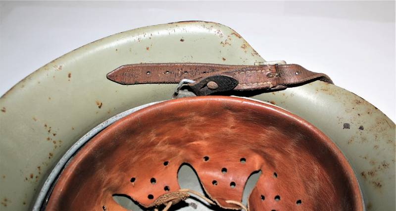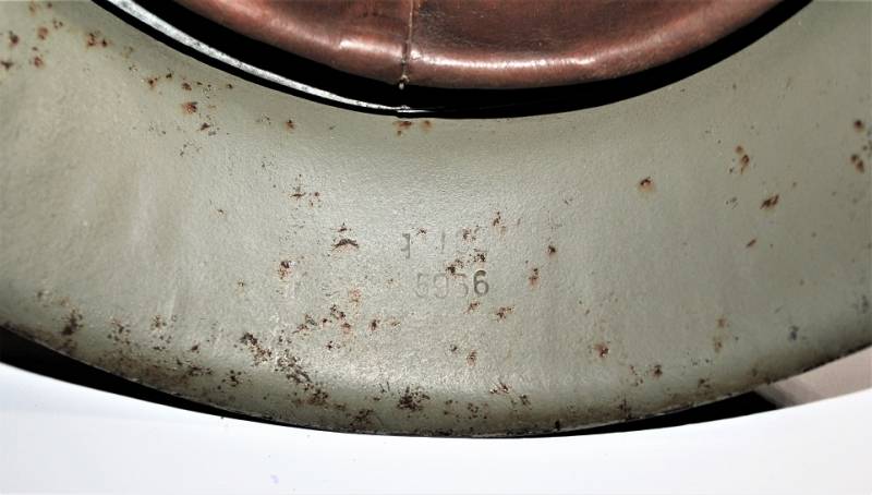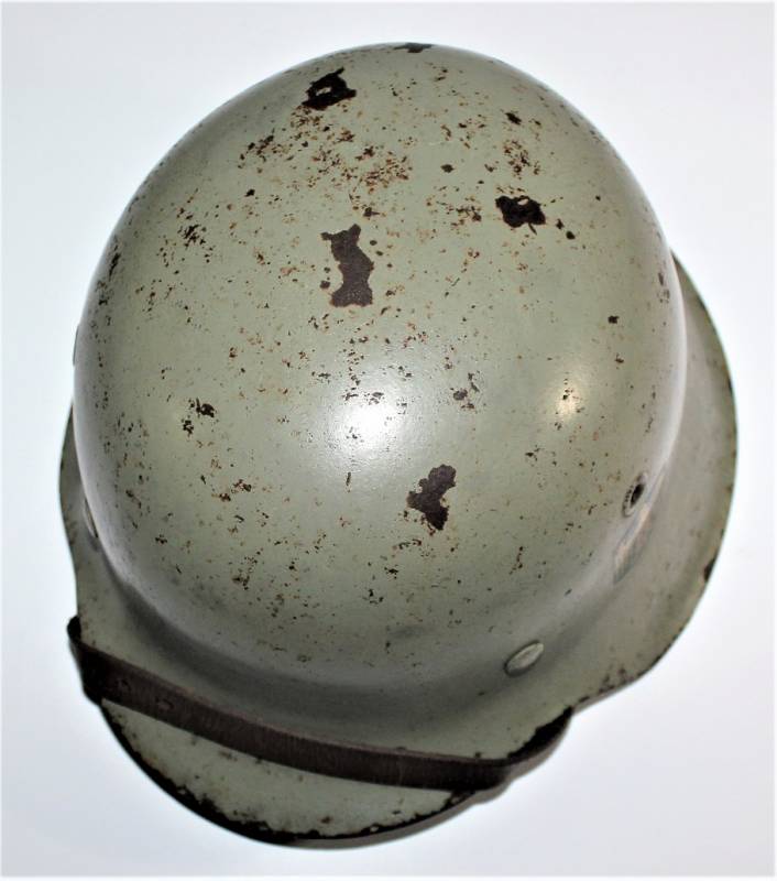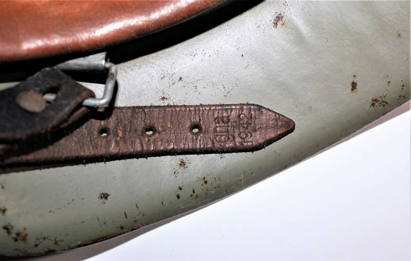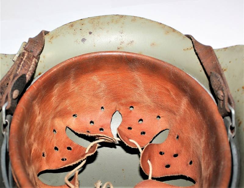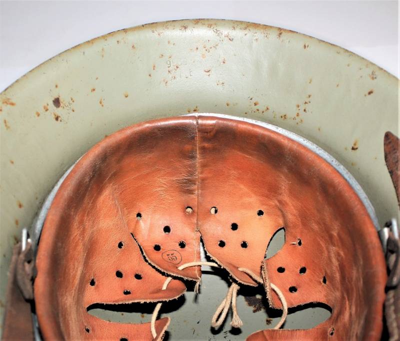 Inside the helmet on the cap you can see the oval acceptance stamp, iron marked with manufacturer code and lot number, iron size 62 and skin size 55. Original 100% WWII period.