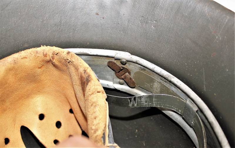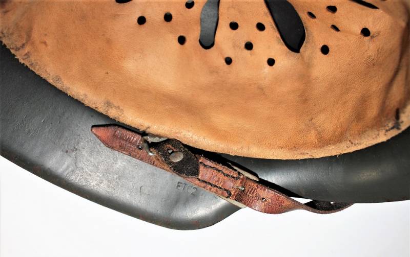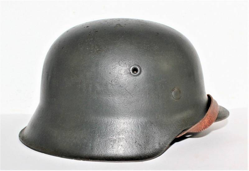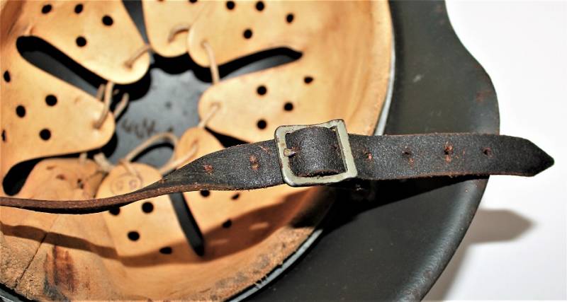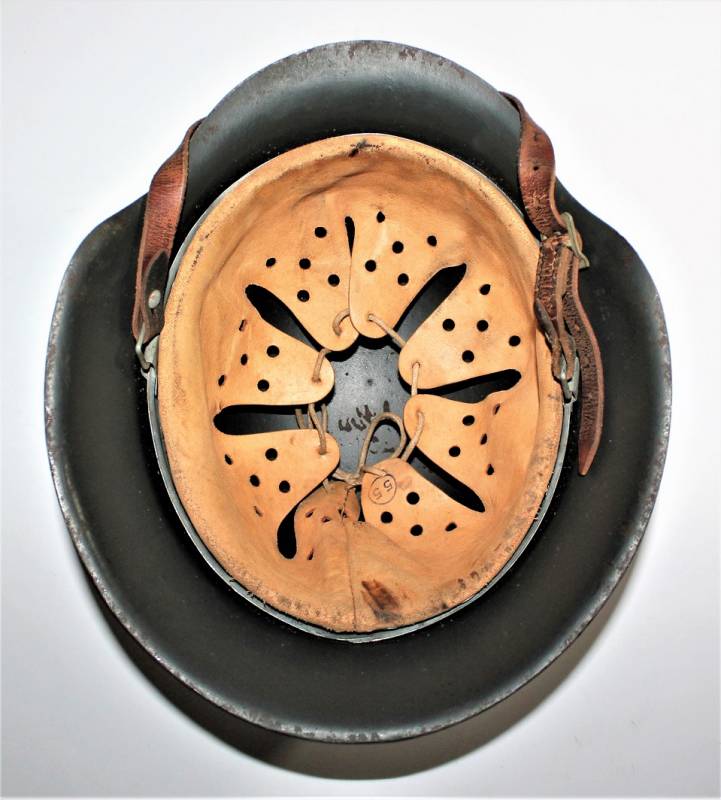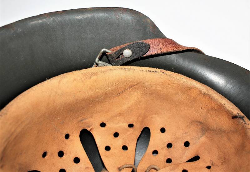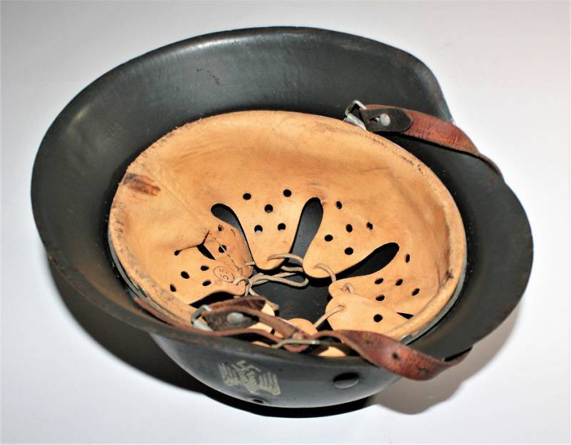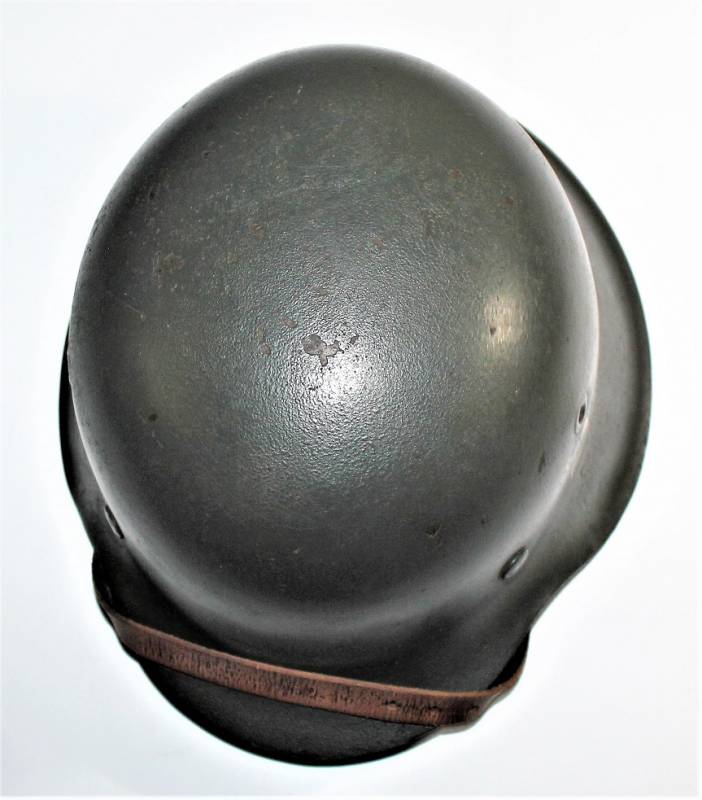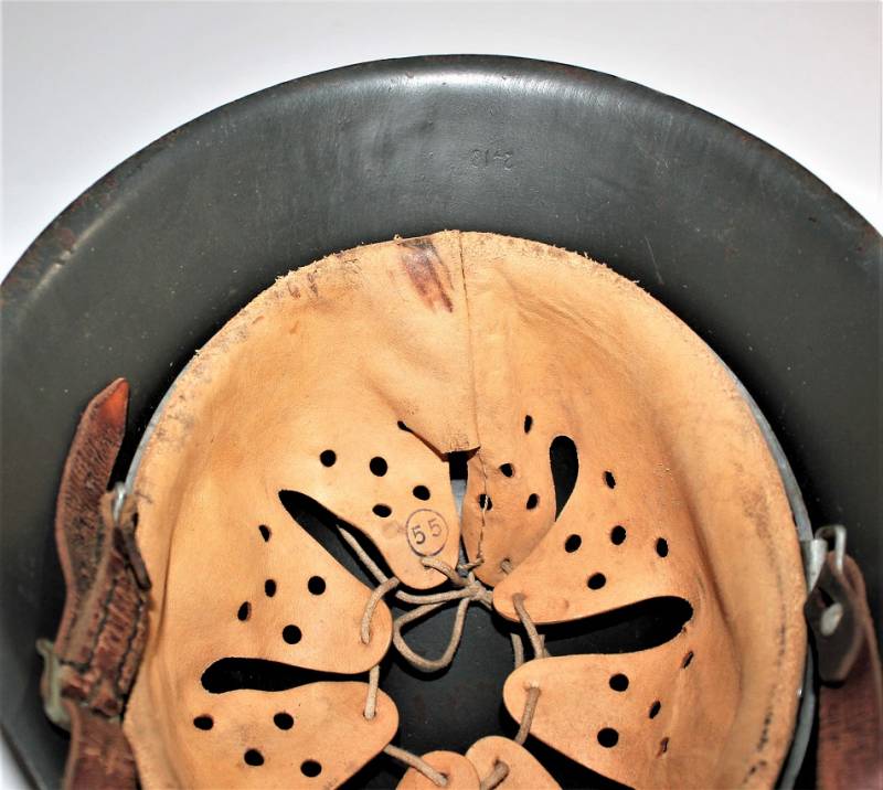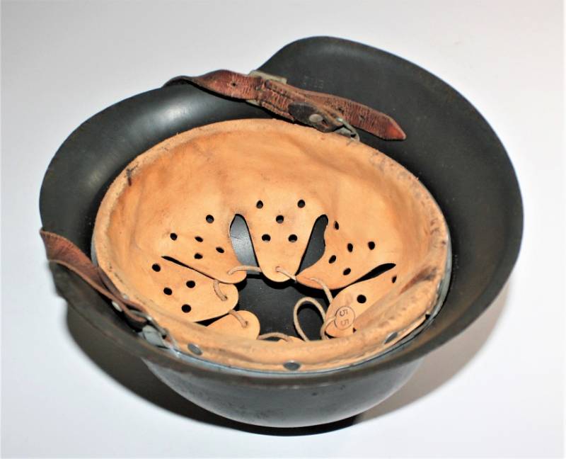 Beautiful M42 monodekal helmet in excellent condition, with a slight patina of time and use, complete in all its parts, never removed inside and chinstrap, born in dark wrinkled 90% anti-reflection feldgrau color, 95% decal only slightly patina of the time, iron marked with manufacturer code ET62 and lot number, leather size 55, chinstrap marked with RBN n ...