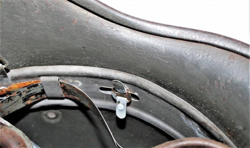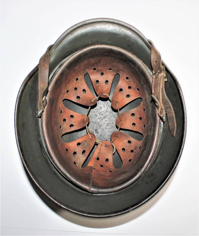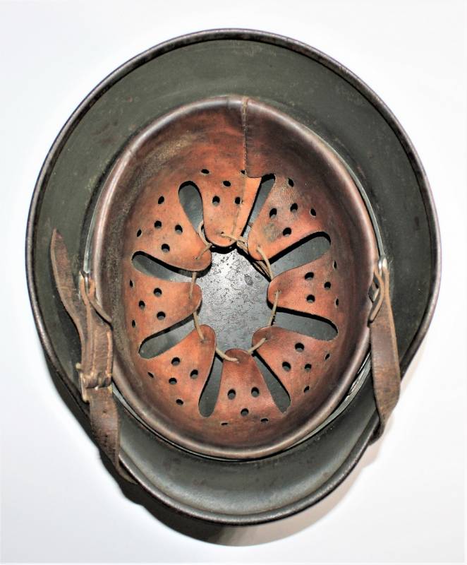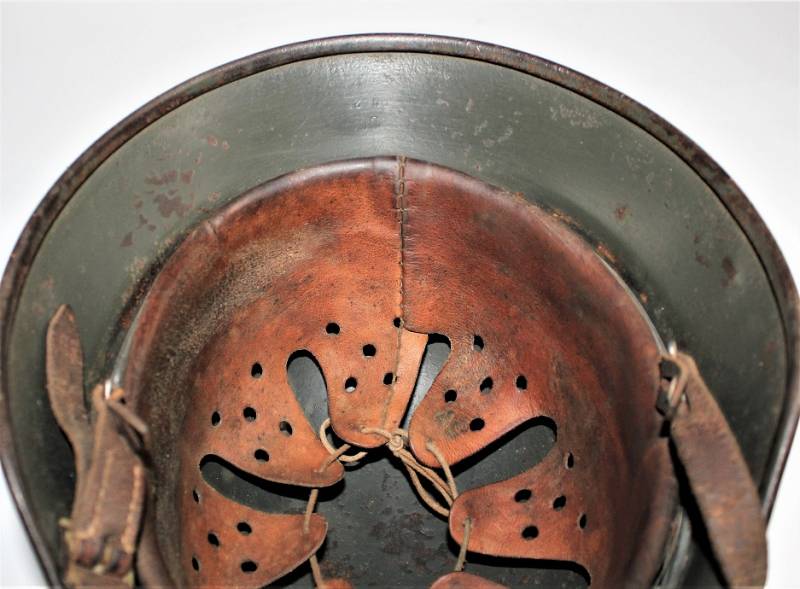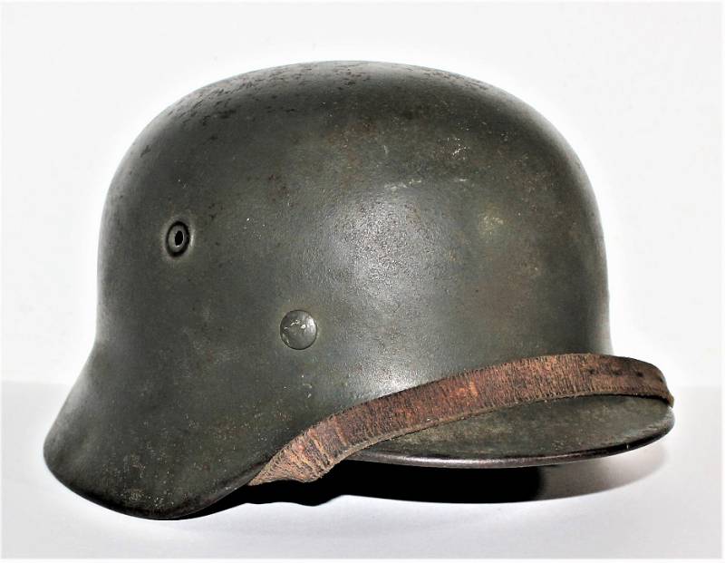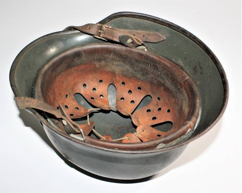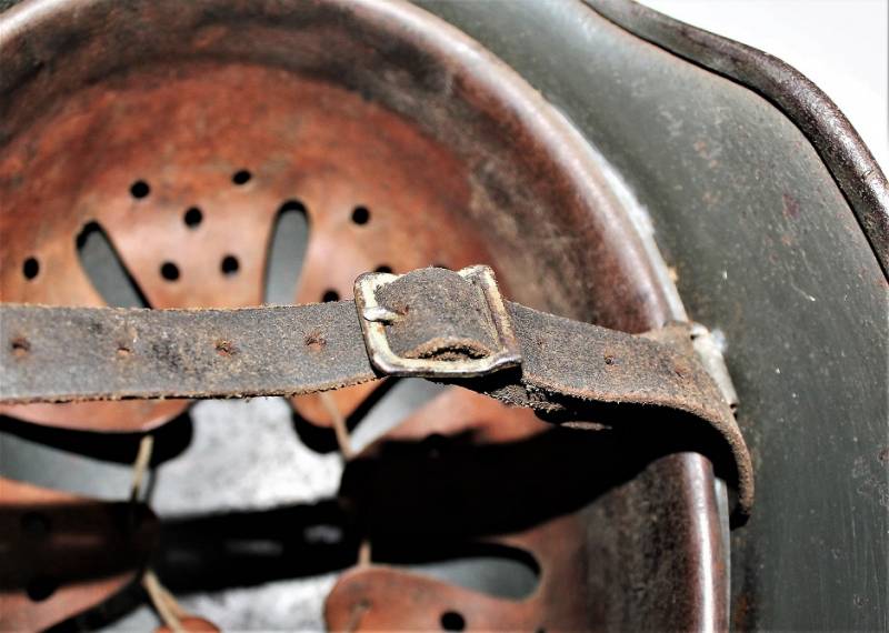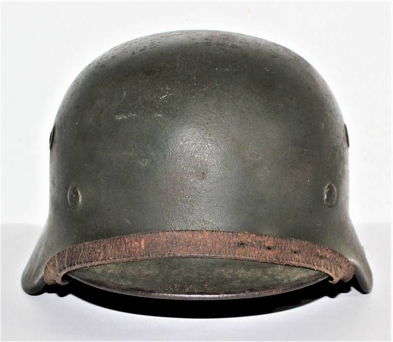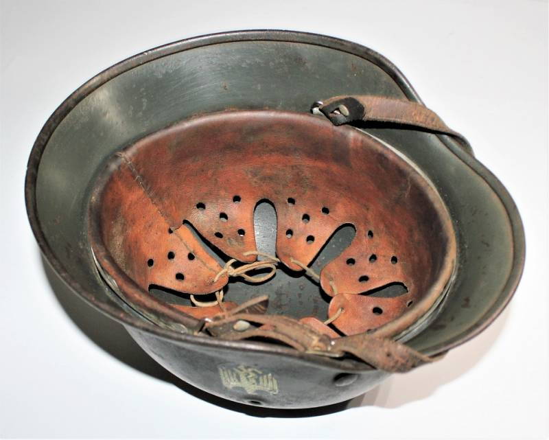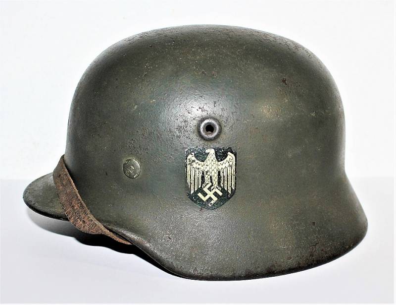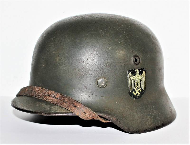Helmet M40 singoldekal of the WH born in wrinkled feldgrau green color with 85% paint in good condition with patina of time and use, not restored or repaired, complete in all its parts, liner and chinstrap never disassembled, liner leather in good condition, still soft and not damaged only patinated from use, chinstrap marked with the name of the manufacturer and the date 1942, dekal in good condition 85% patinaed by time, iron marked with manufacturer code Q64 and lot numbers, leather size 57 .