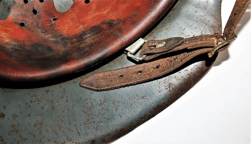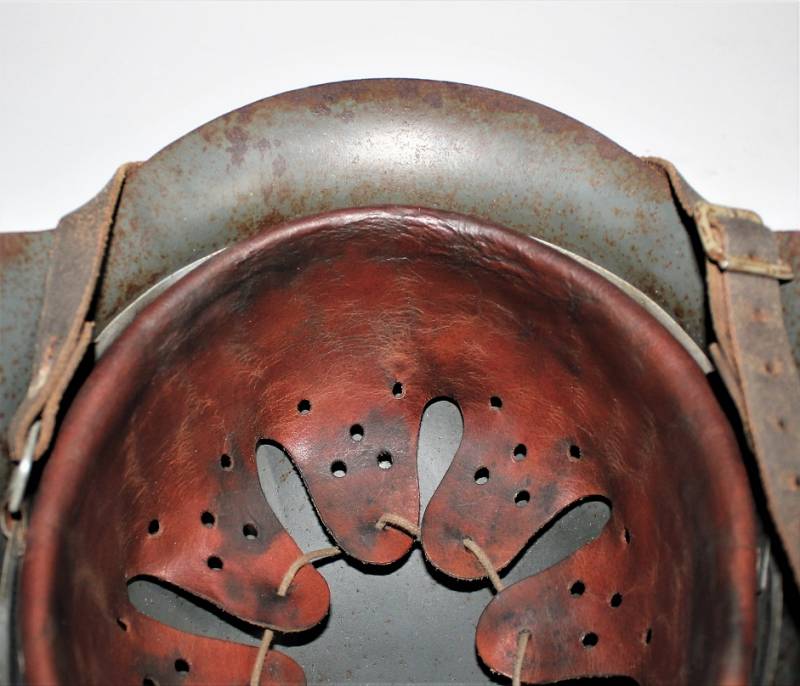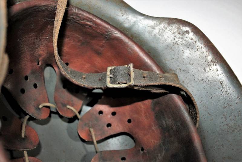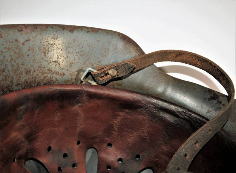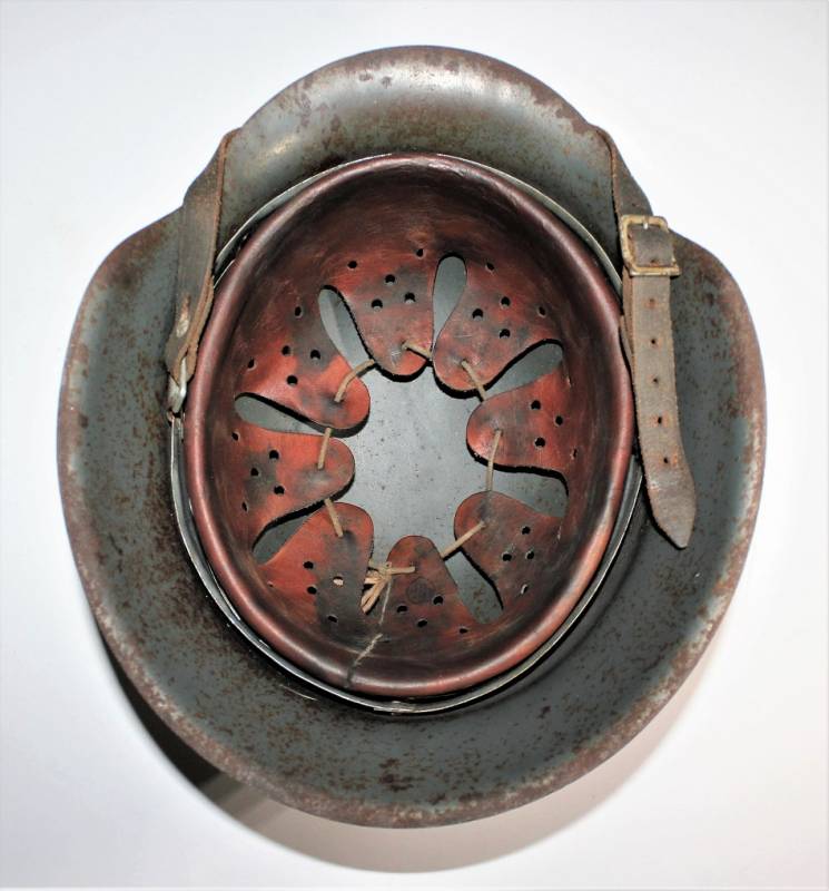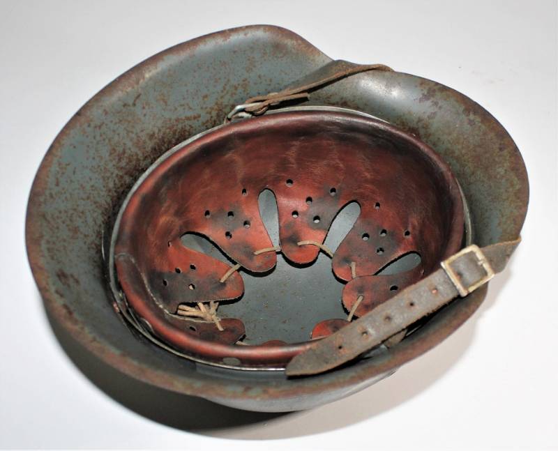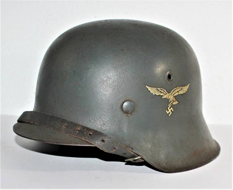 Luftwaffe M42 helmet monodekal in excellent condition, born in Luftwaffe wrinkled blue color, not restored or repaired and never disassembled, complete in all its parts, only light patina of time and use, color 85-90% decal at 95 %, leather in excellent condition, not damaged only patinated by time, iron marked with manufacturer code and lot number, iron size 64, leather size 57, chinstrap marked with manufacturer code and date 1943.