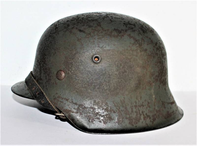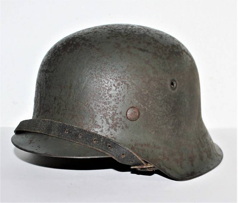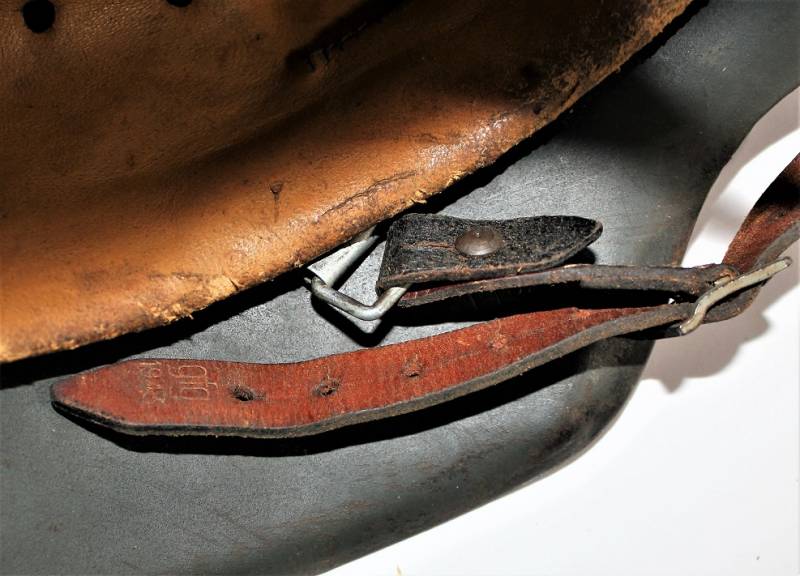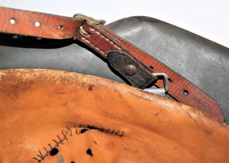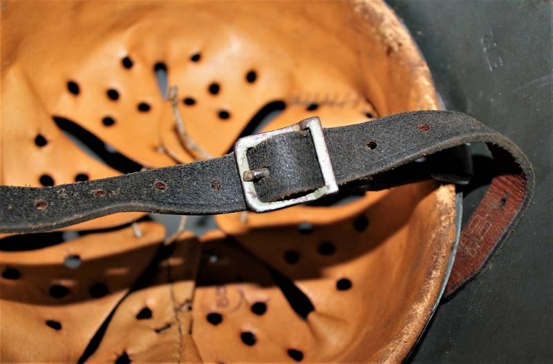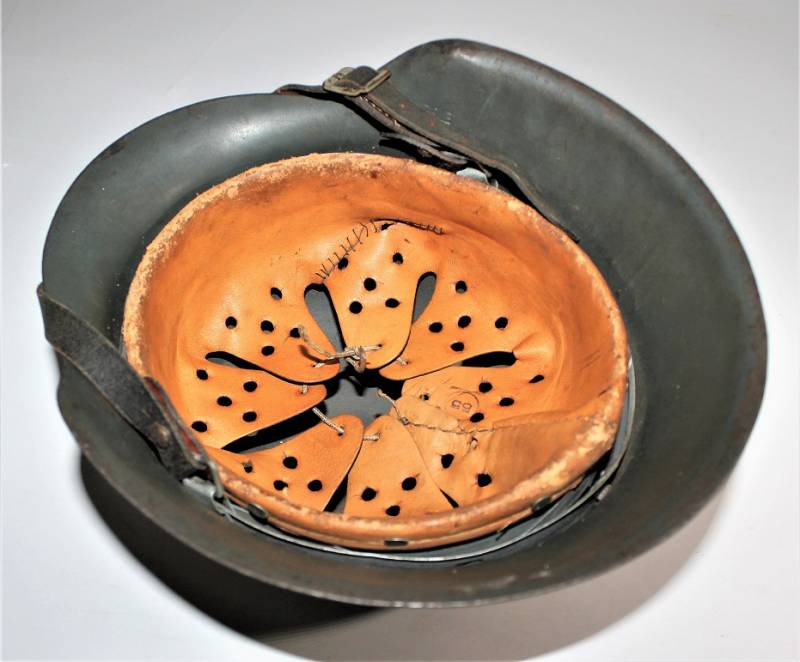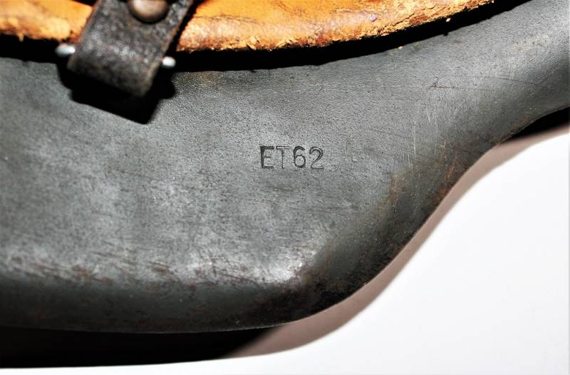 M42 helmet WH-LW-SS born without insigna in good condition with patina of time and use, complete in all its parts, liner and chinstrap never disassembled, born in 70% smooth feldgrau paint, liner leather in good condition but with a repair on the left front side (see photo) marked on the iron with manufacturer code ET62 and lot number, leather size 55, chinstrap marked with manufactured code and date 1943.