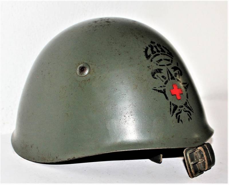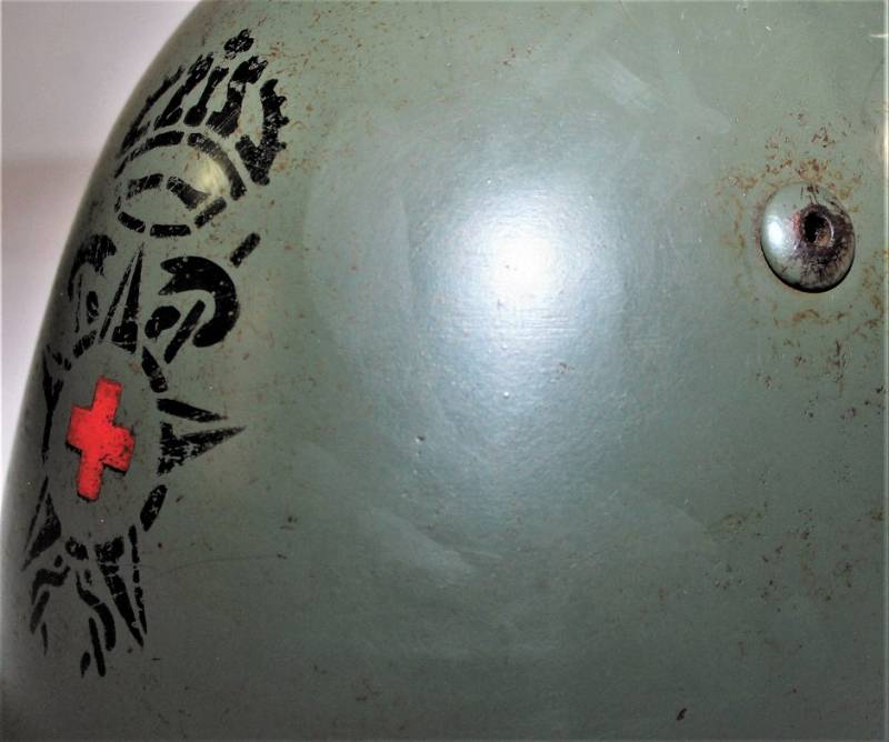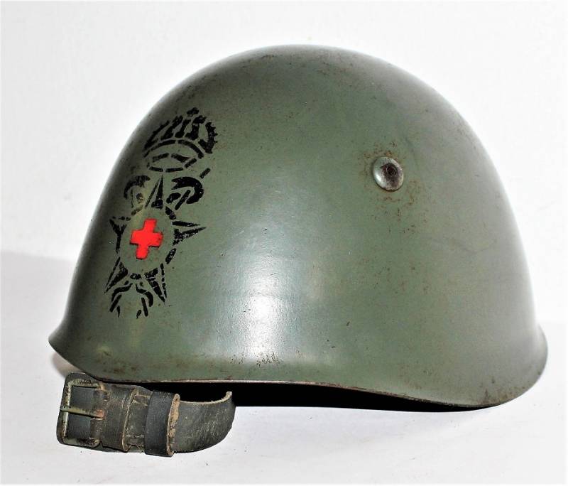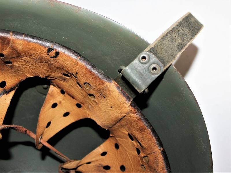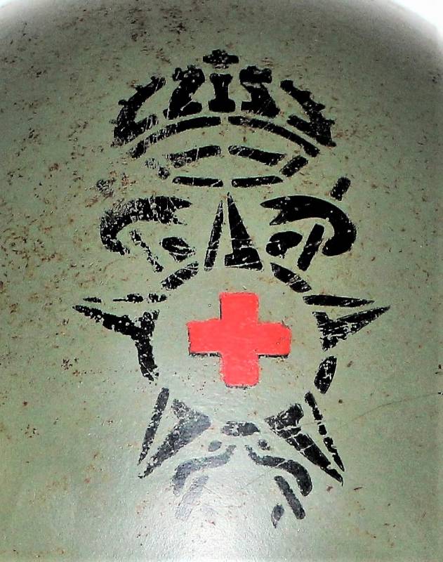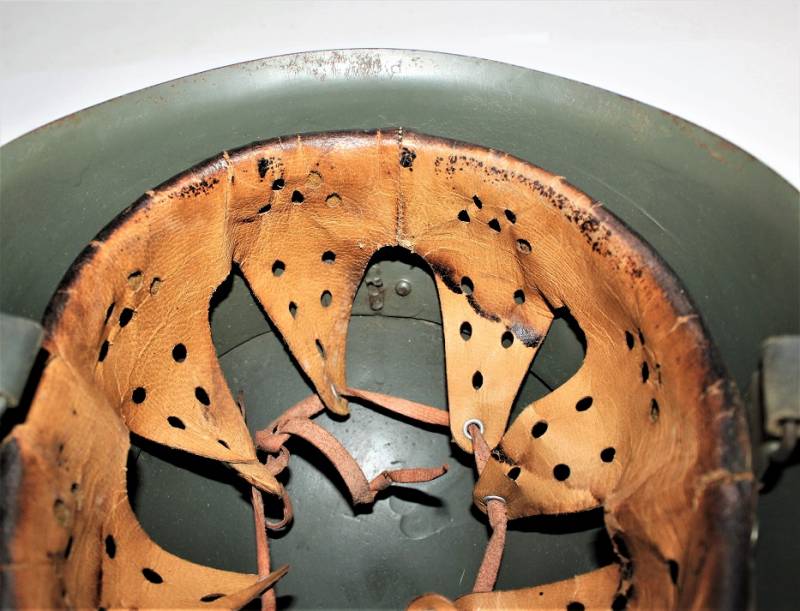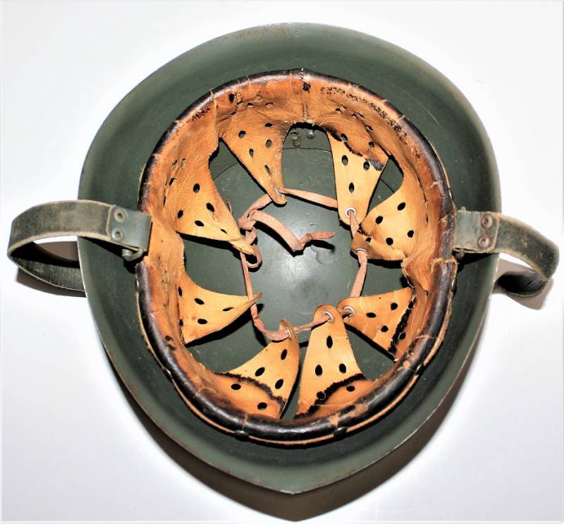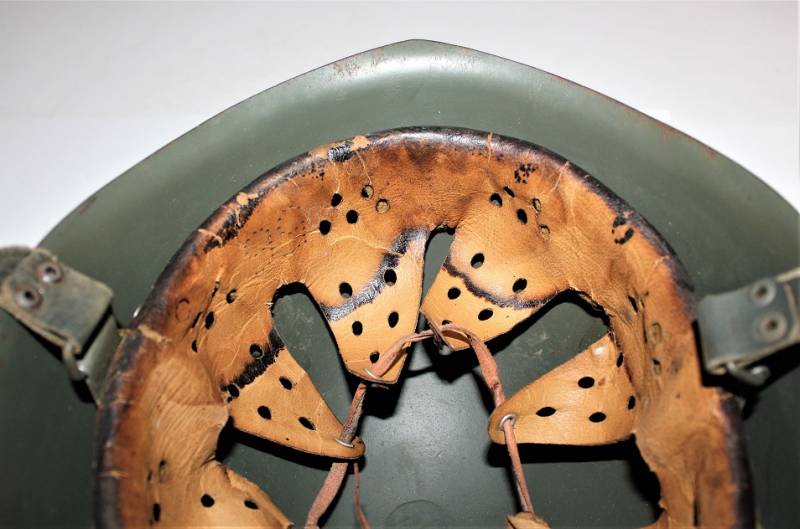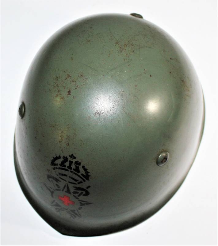 Helmet model 33 R.E. of the Red Cross Medical Officers in almost 100% light green color, excellent condition, not restored or repaired, never disassembled, complete in all its parts with a very light patina of time and use, the leather of the liner is in good condition as well like the chinstrap without damage, iron marked with lot numbers. Marked on the inside of the leather and on the metal support of the chinstrap with Arsenali di Torino stamp and punch.