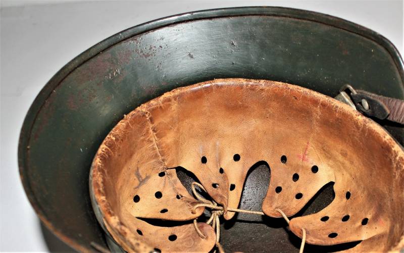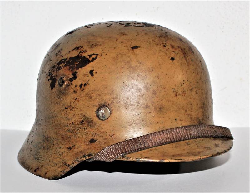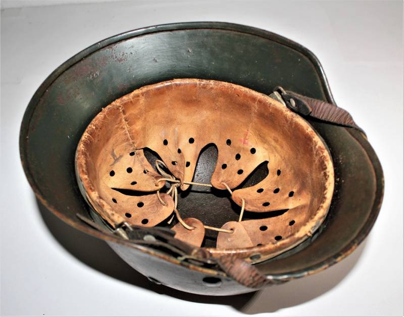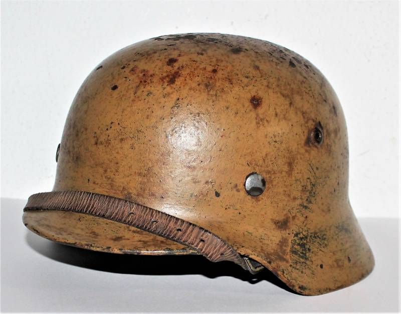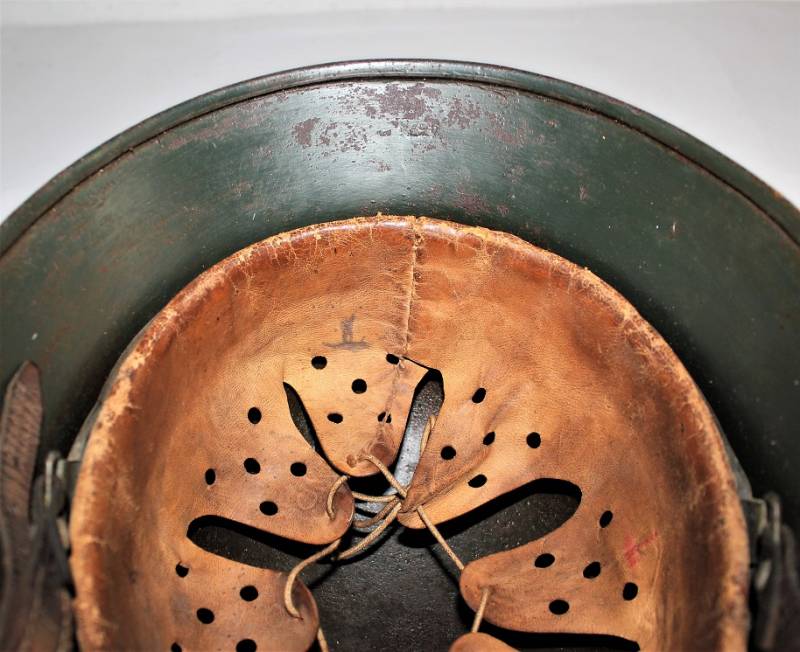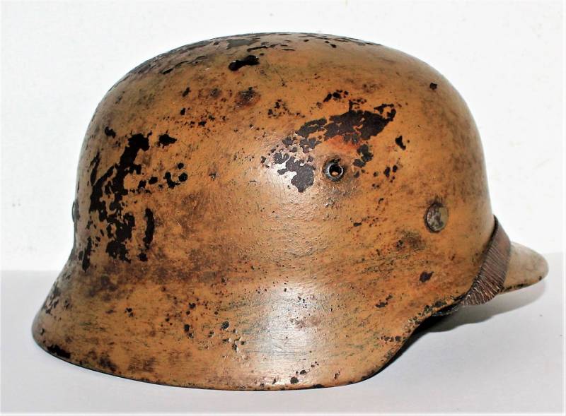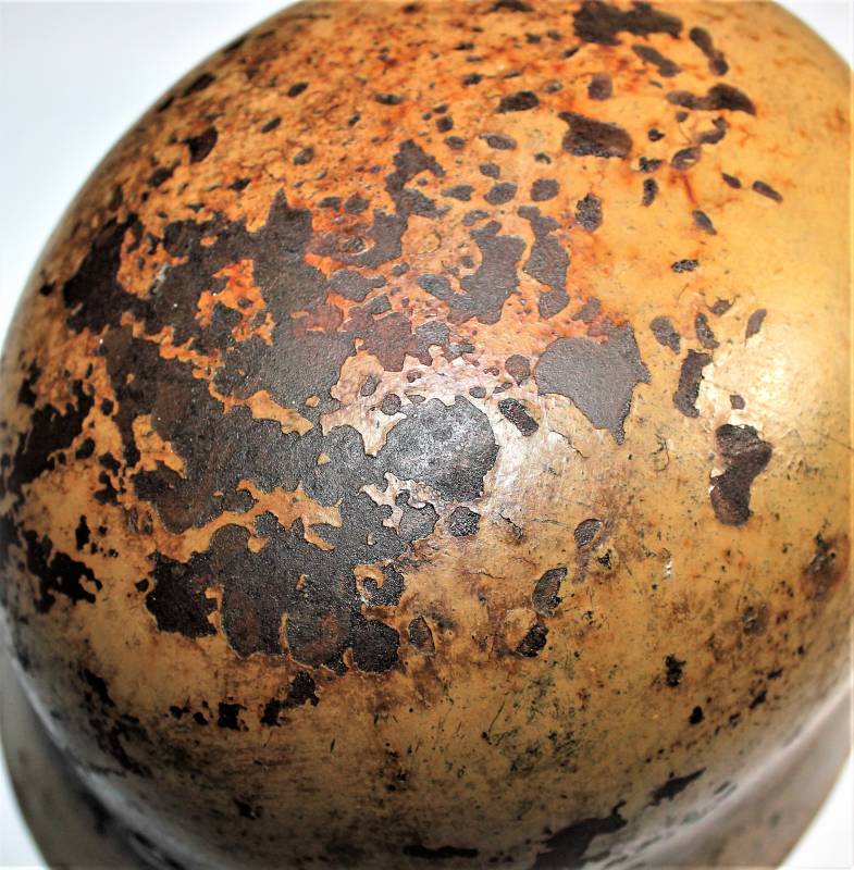 Helmet M35 of the WH in DAK yellow camouflage, continental or Italian front in good condition, with patina of time and use, but fascinating, not restored or repaired, camouflage coloring 60-70%, liner and chinstrap never disassembled and undamaged leather, chinstrap marked with the manufacturer´s name and date, iron marked with the manufacturer´s code and lot number.