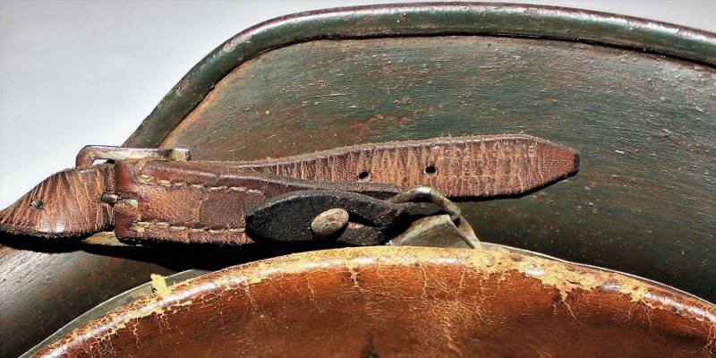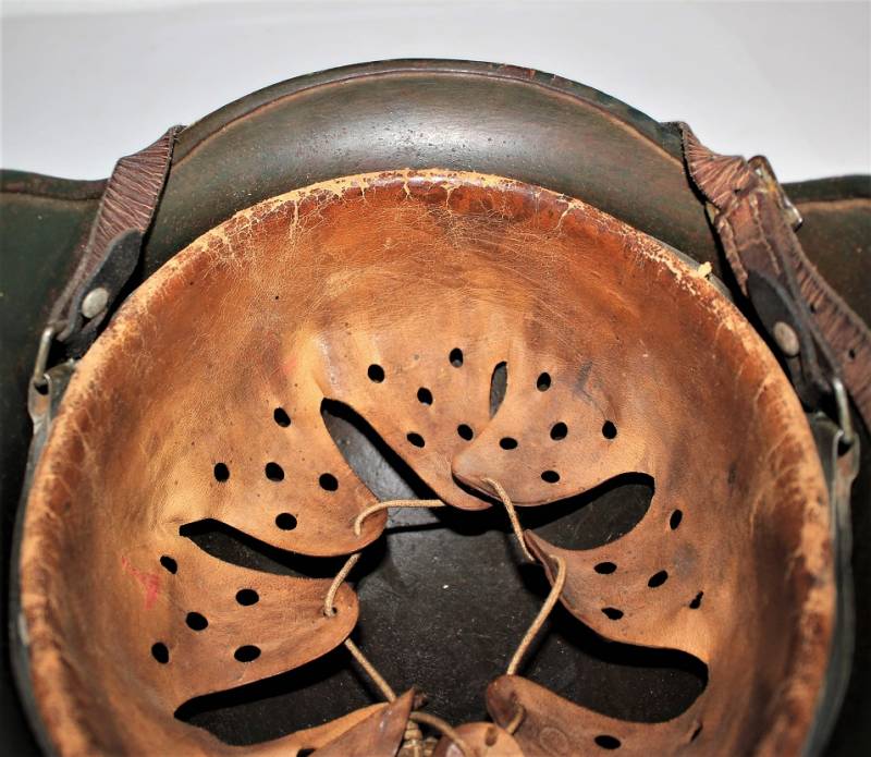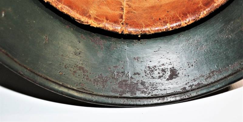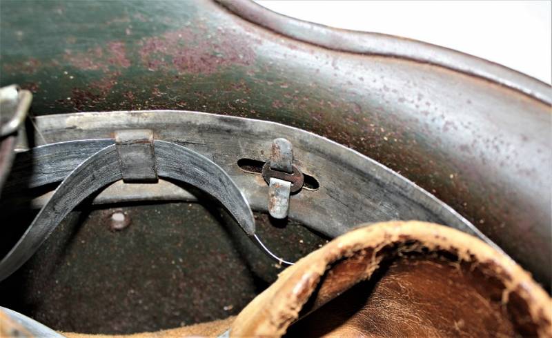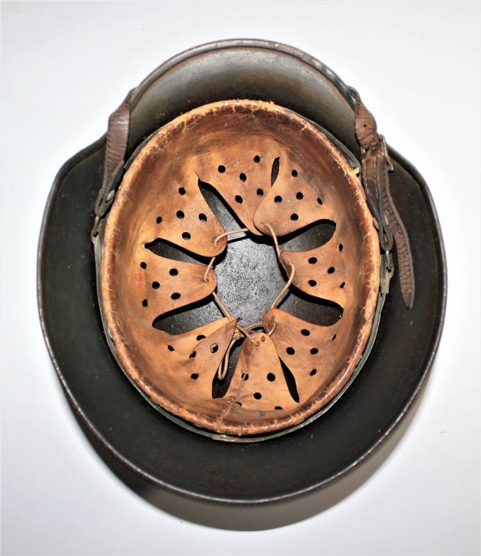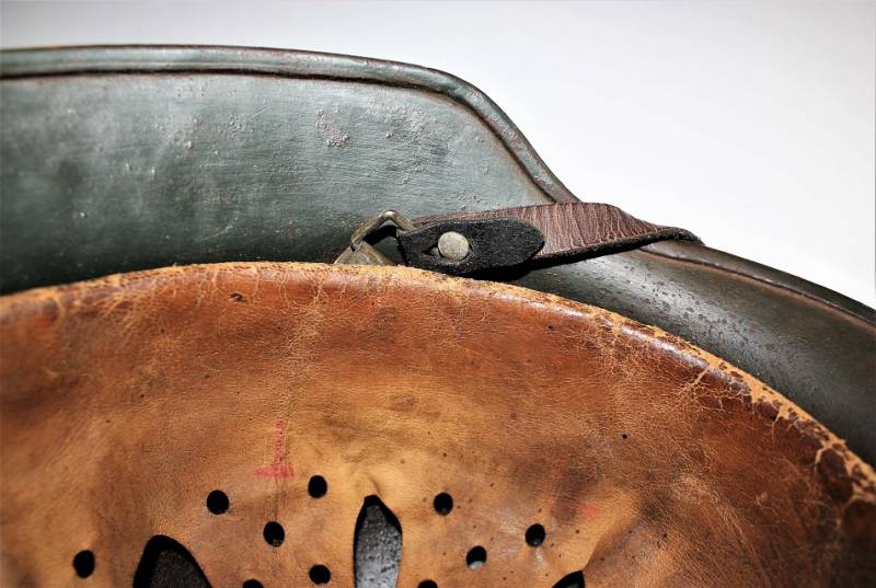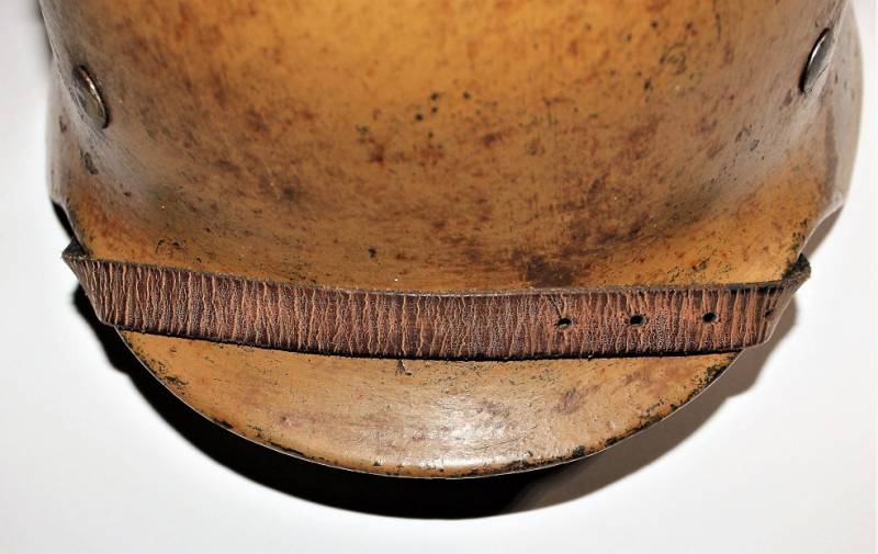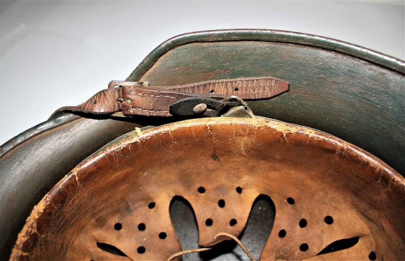 Helmet M35 of the WH in DAK yellow camouflage, continental or Italian front in good condition, with patina of time and use, but fascinating, not restored or repaired, camouflage coloring 60-70%, liner and chinstrap never disassembled and undamaged leather, chinstrap marked with the manufacturer´s name and date, iron marked with the manufacturer´s code and lot number.