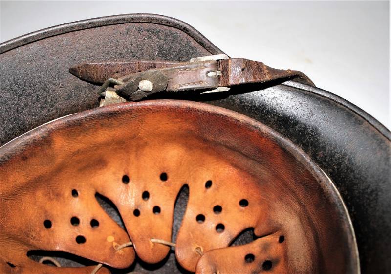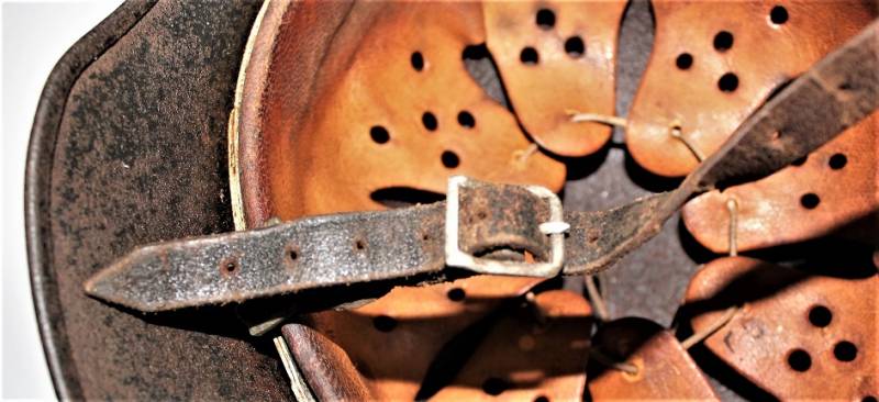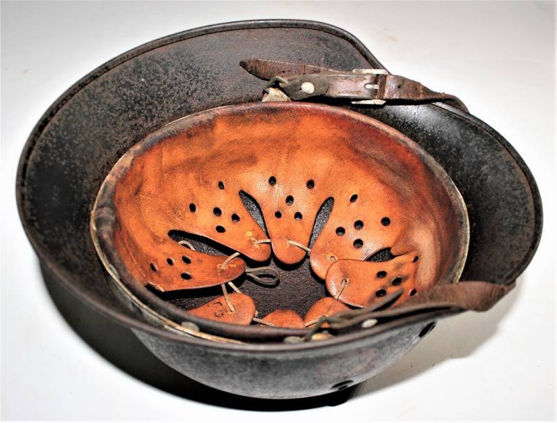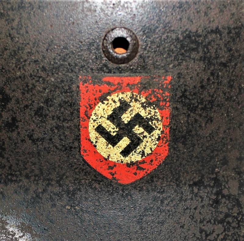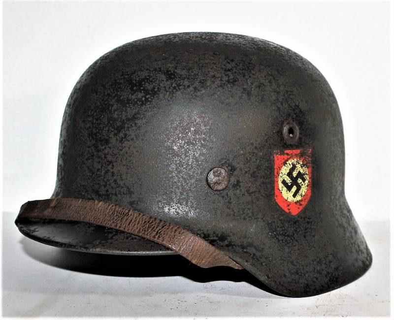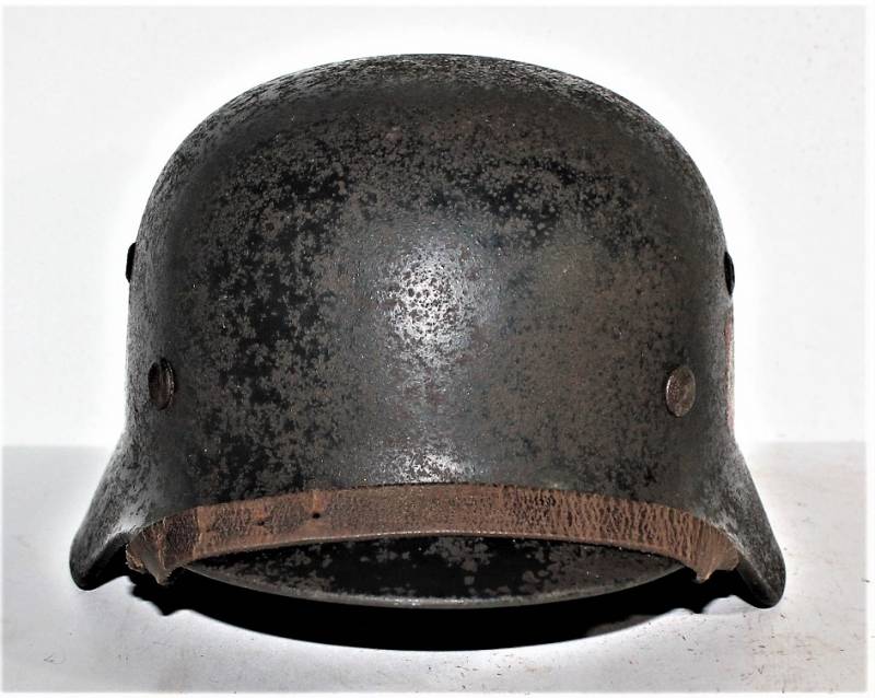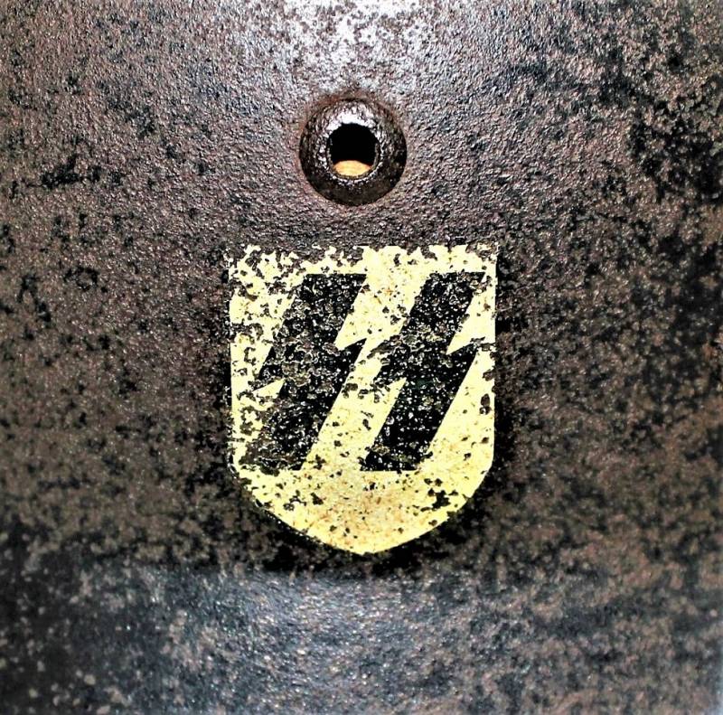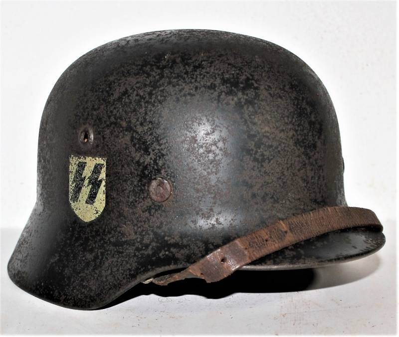Helmet mod.M35 Algemine SS dubledekal, conditions lived with patina of time and use, complete in all its parts, not restored or repaired, liner and chinstrap never removed, the skin of the liner is slightly dry but not damaged, chinstrap in good conditions, you can see the manufacturer´s code, the color of the helmet is opaque black at 50%, 80% runway decal, party decal at about 60%. The inner shell is partly rusty, marked on the iron with lot number and size Q62, leather size 55. Original 100% WWII period.