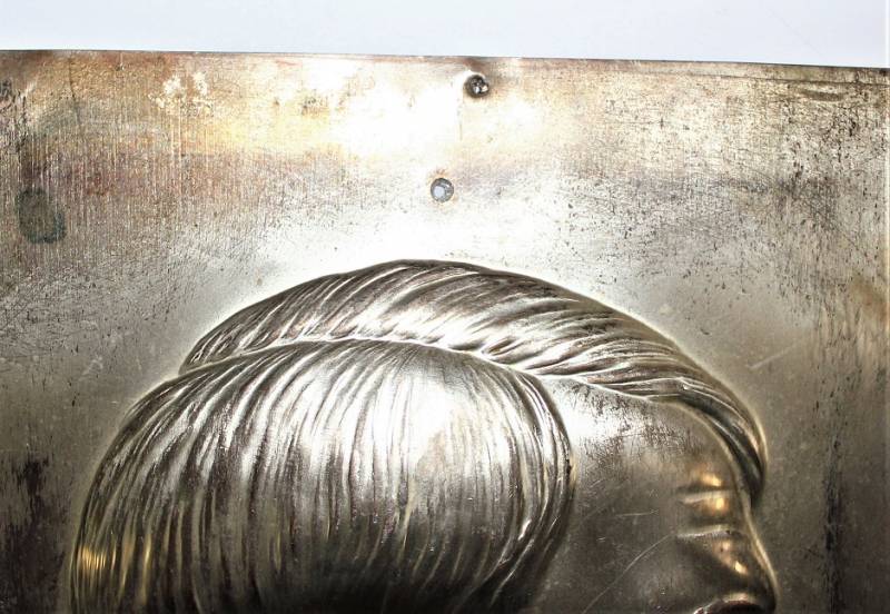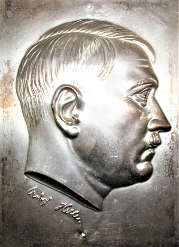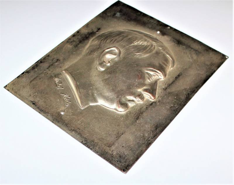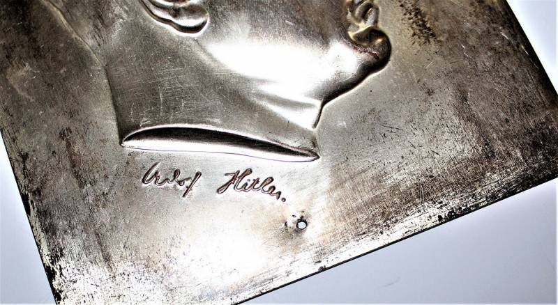 Small picture in silver printed sheet depicting the face of Adolf Hitler and his signature, good condition, excellent details, all with age patina. Measures approximately 16.5 x 20.5 cm. Original 10% WII period.