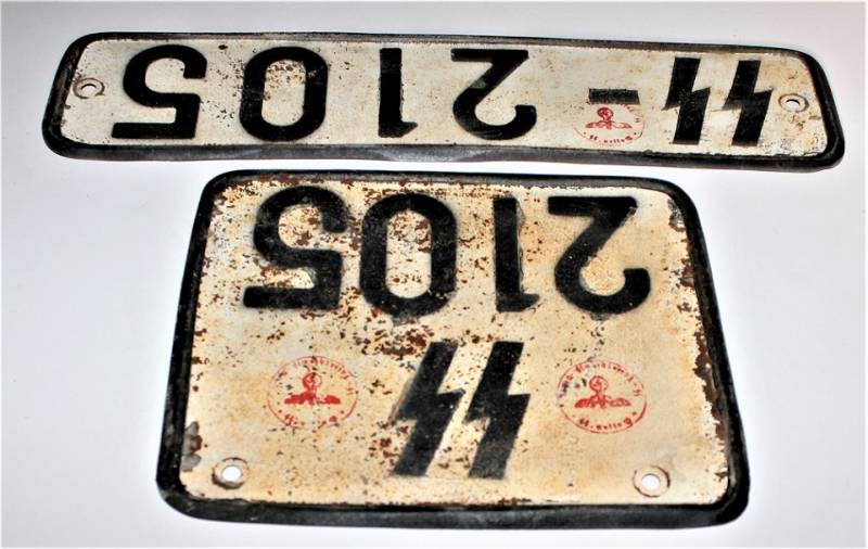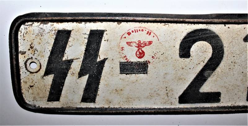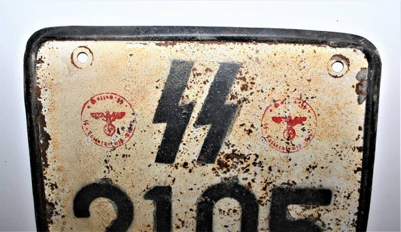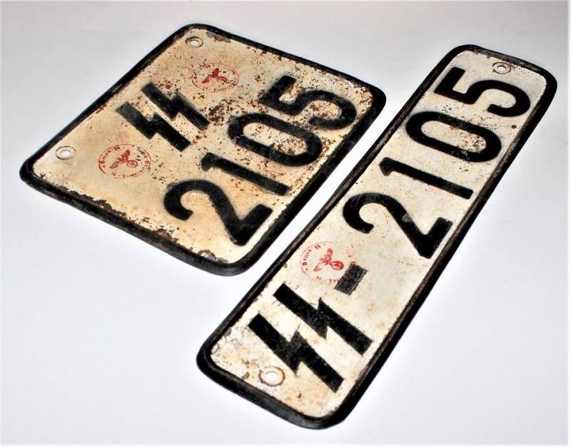 SS licence plates for motor vehicles, in good condition but with a patina of time and use, made of stamped sheet metal, clearly visible numbers and SS acceptance stamps also visible. 100% original WWII period.