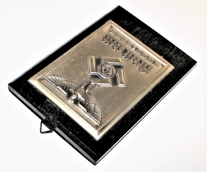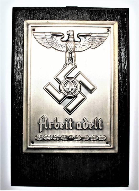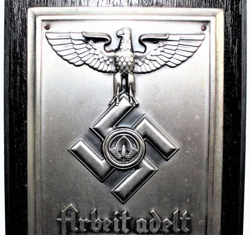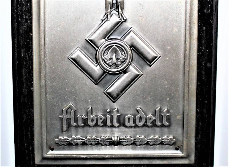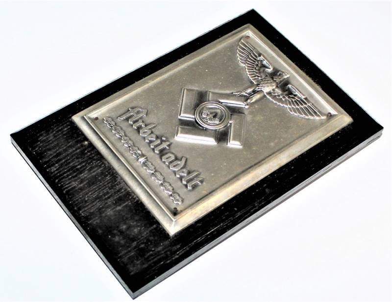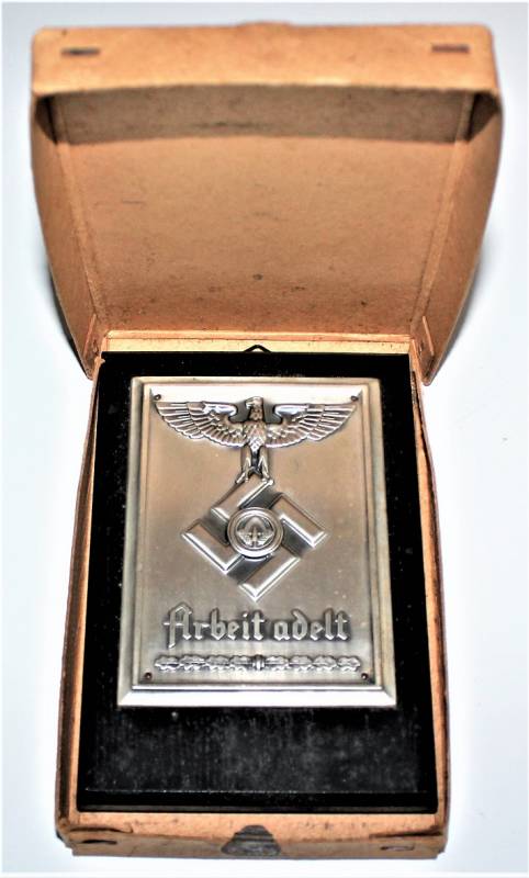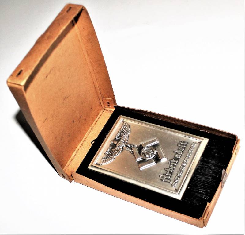 Superb and rare R.A.D. memory sheild in sheet metal "ARBEIT ADELT" in excellent condition, almost like new, complete with its cardboard box, the details of the eagle, design and writing are wonderful, interesting and very rare to find !! Original 100% WWII period.