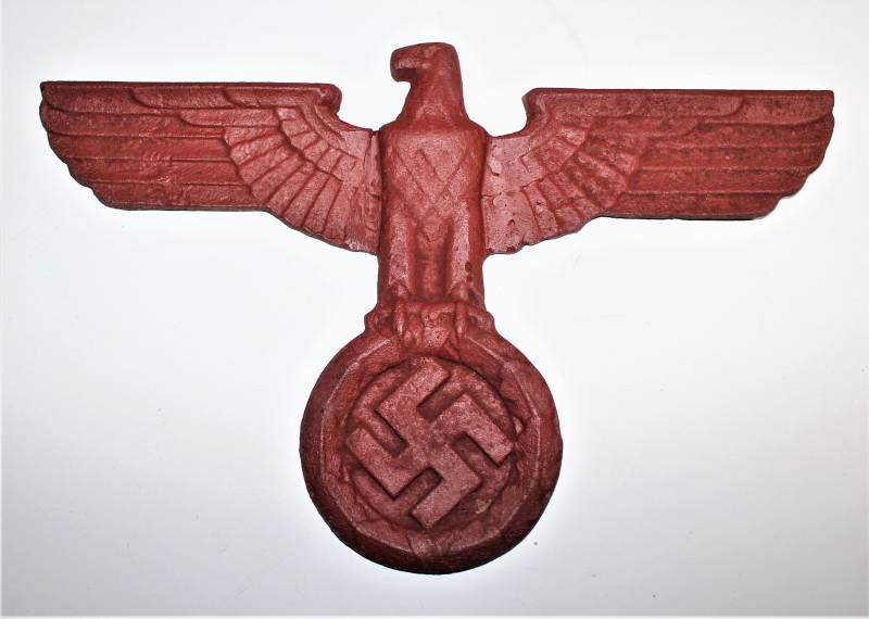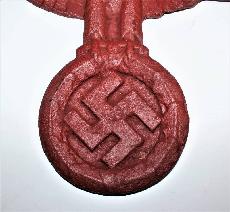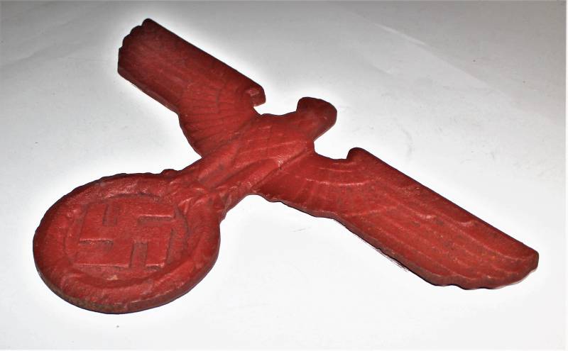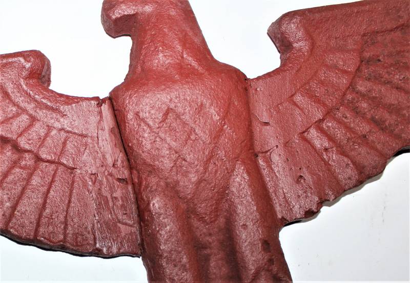 Wall eagle in cast iron, very worn, repainted with red color, the wings have been repaired and re-welded to the eagle´s body. Size about 40x25. 100% original WWII period.