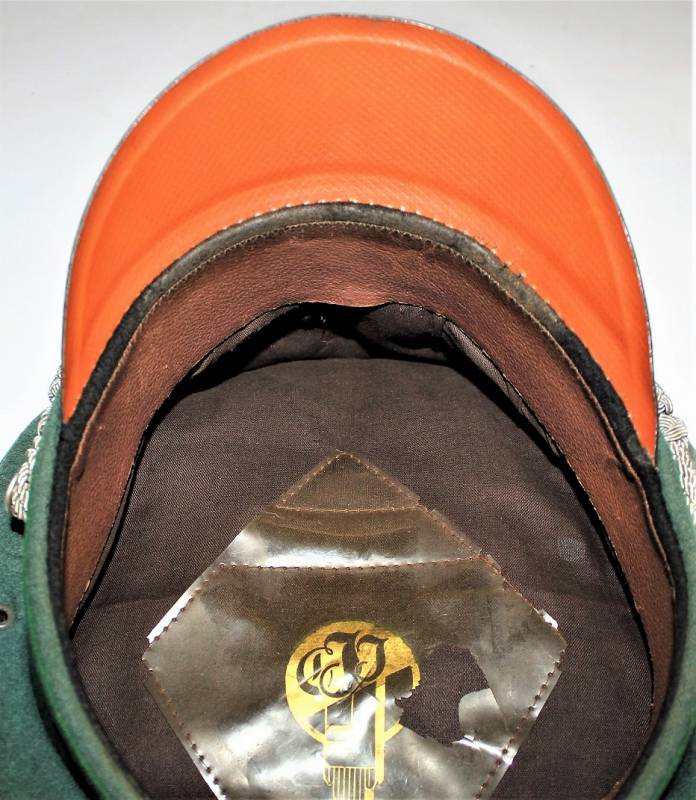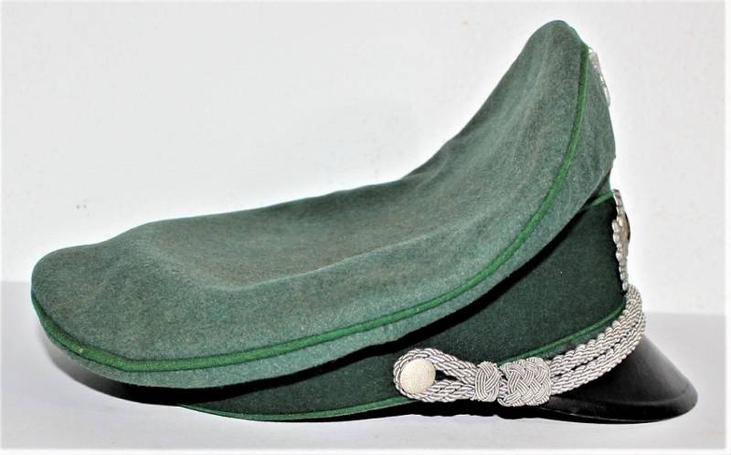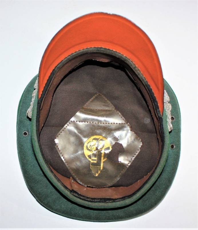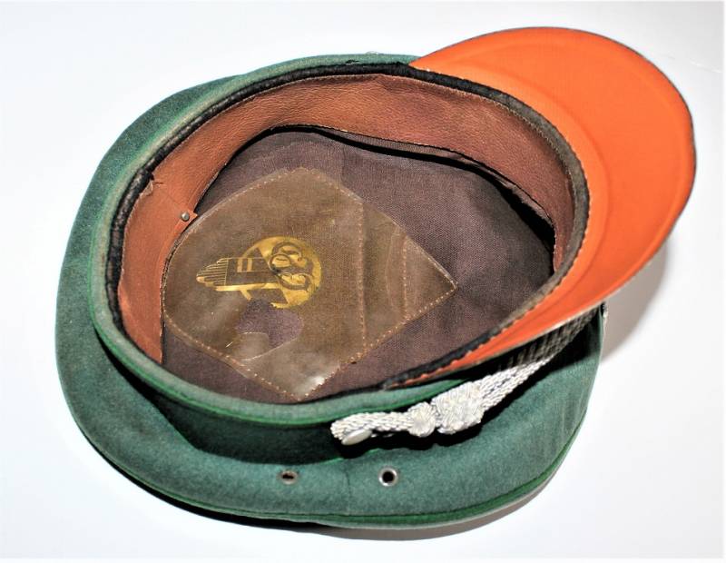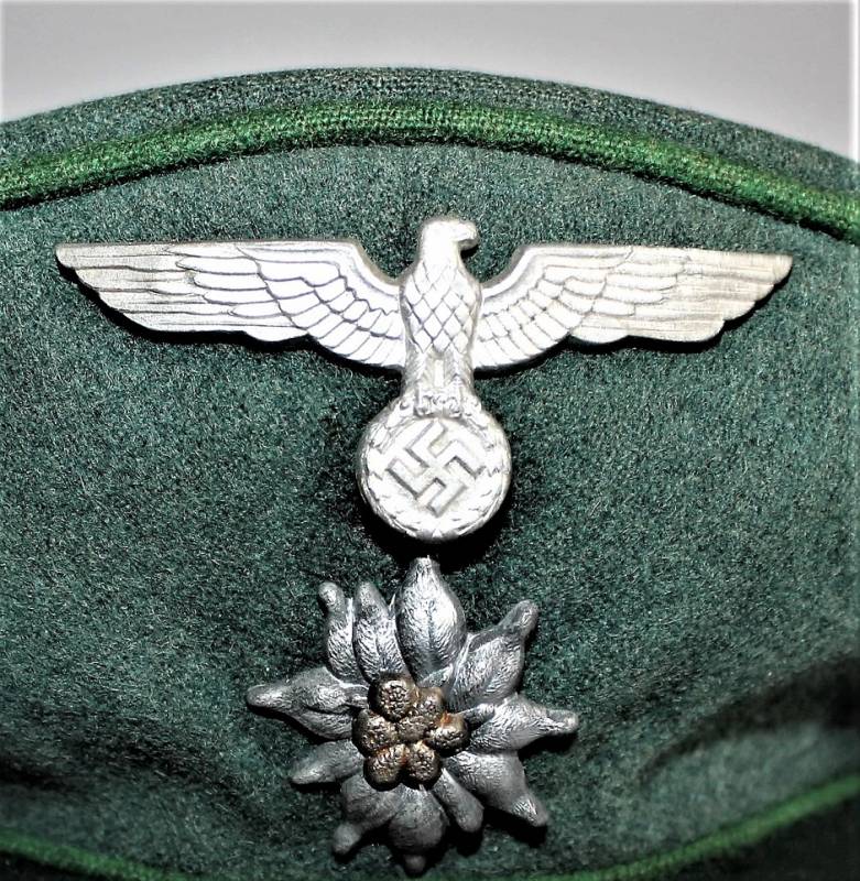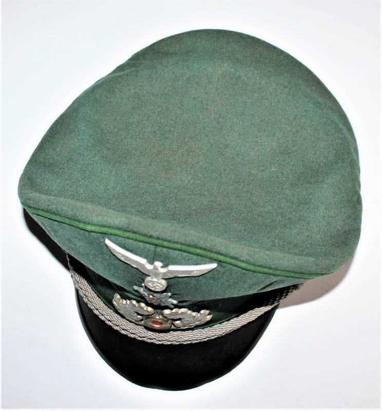 Officer Schirmmutze WH Gebirgsjäger waffenfarbe green, excellent condition, with slight patina of time and use, unrestored or repaired, without holes or tears, only missing a small part of the celluloid diamond, insigna never disassembled, internally marked with logo manufacturer and within the sweatband soldier´s name and date. Size about 56-57. Original 100% WWII period.