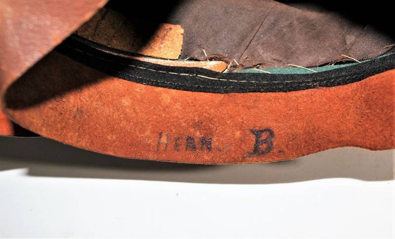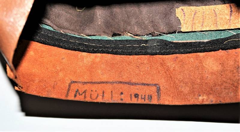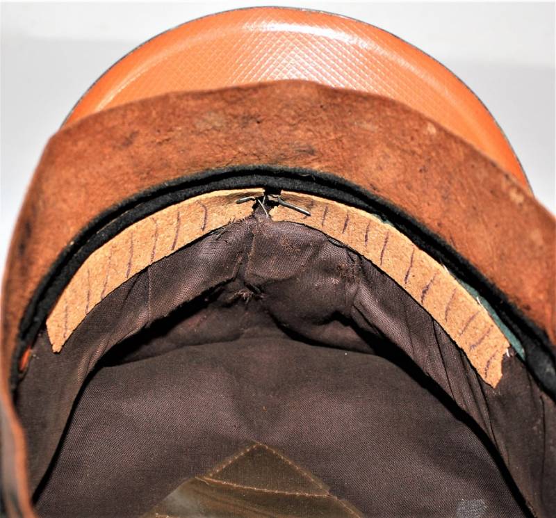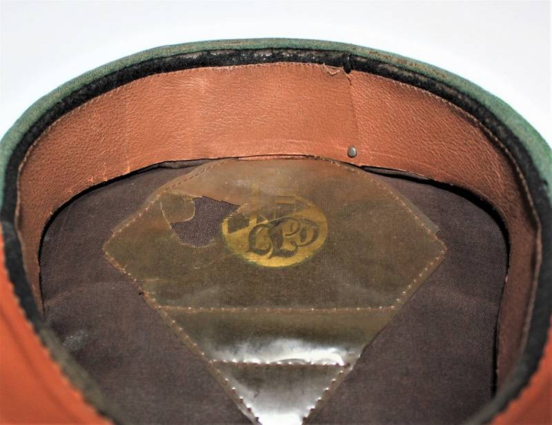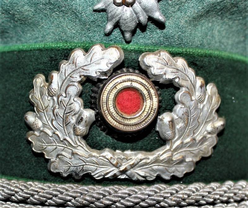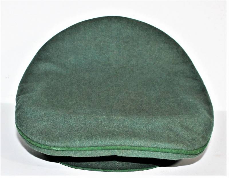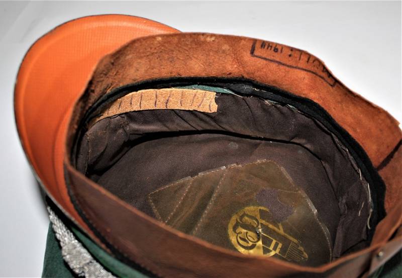 Officer Schirmmutze WH Gebirgsjäger waffenfarbe green, excellent condition, with slight patina of time and use, unrestored or repaired, without holes or tears, only missing a small part of the celluloid diamond, insigna never disassembled, internally marked with logo manufacturer and within the sweatband soldier´s name and date. Size about 56-57. Original 100% WWII period.