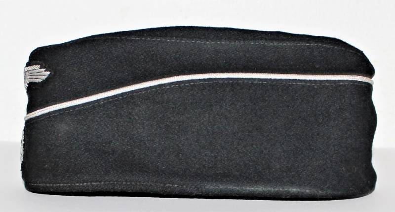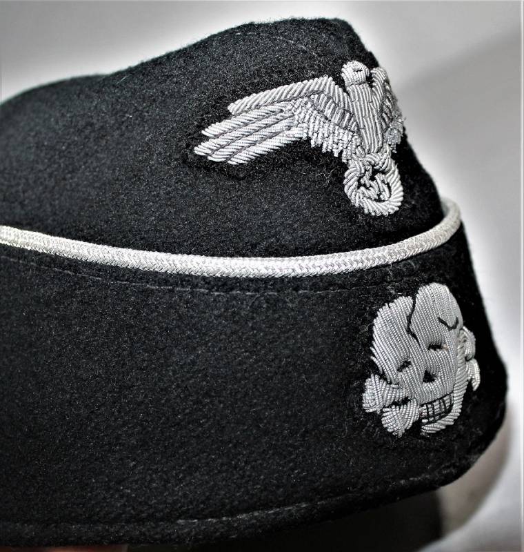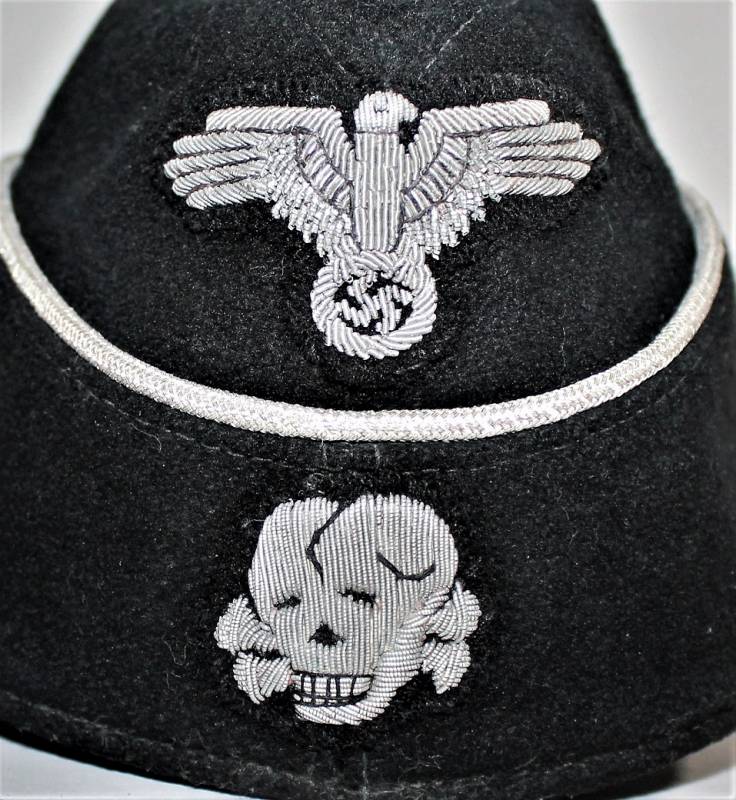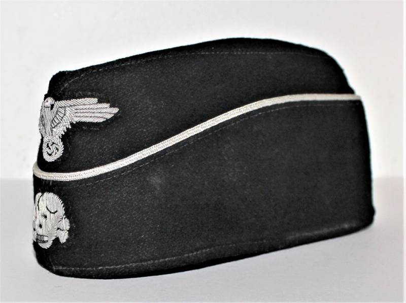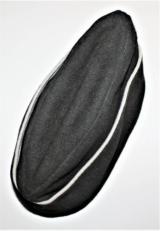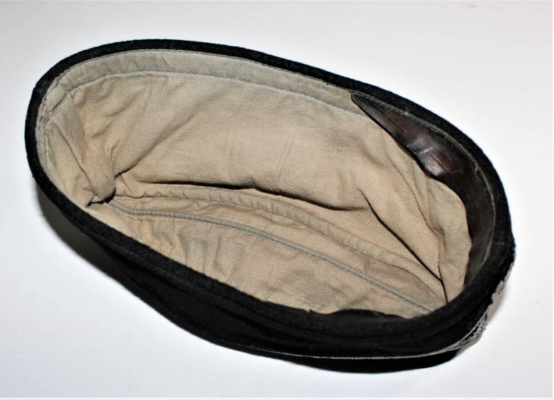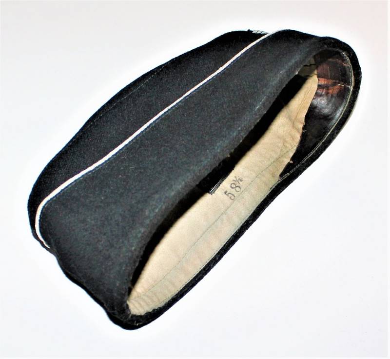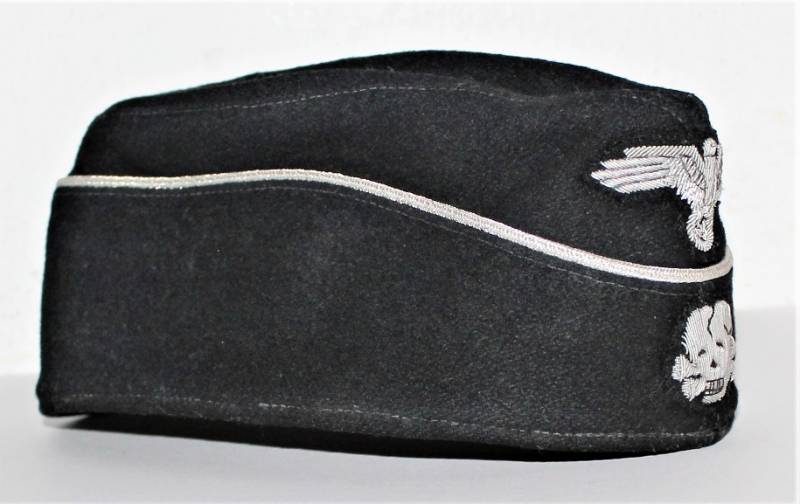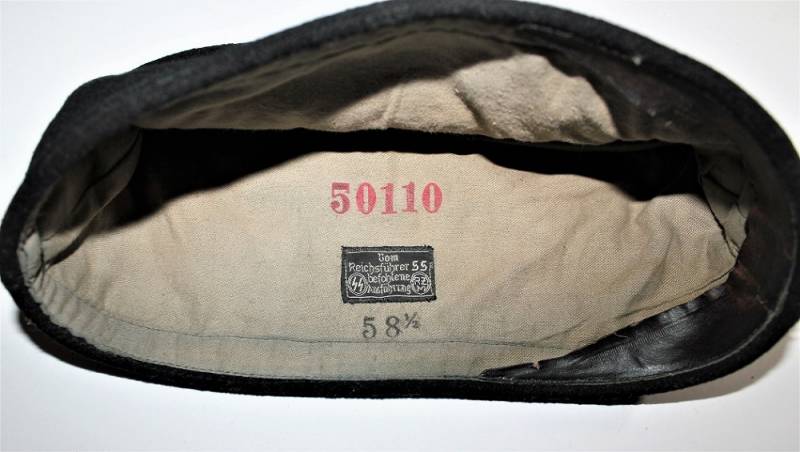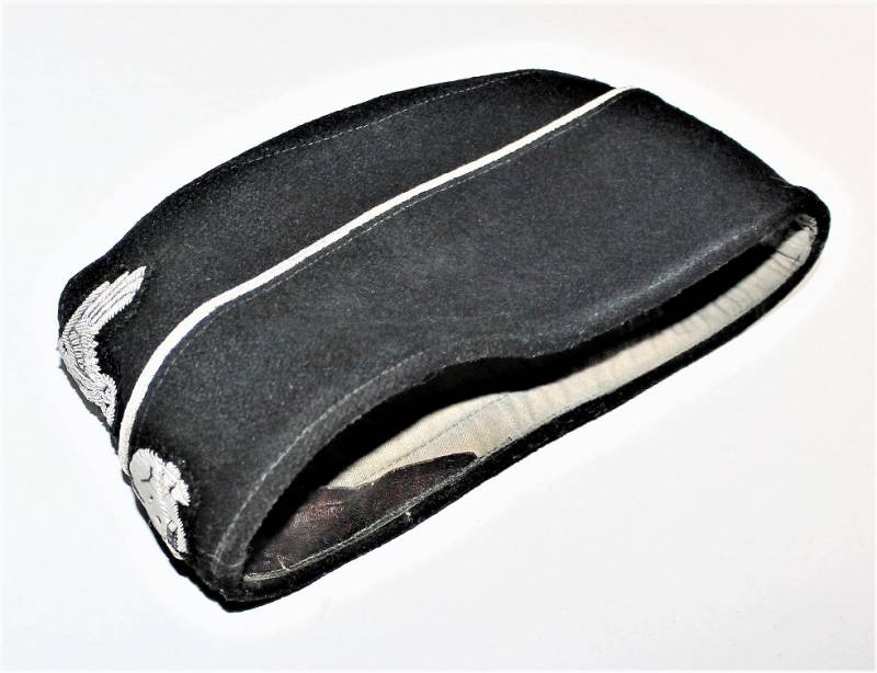 Rare and prestigious field cap M34 from Officer Panzer SS in excellent condition born in black wool cloth, complete in all its parts, not restored or repaired, without holes or tears, perfect stitching, complete with front leather sweat band, slightly dry skin, all with light signs of aging and use, official insigna in silver bullion thread mounted at the era, inside there is the RZM SS fabric label marked with size number 58.5 and serial numbers. The real size is slightly smaller than marked (real size 57-58).