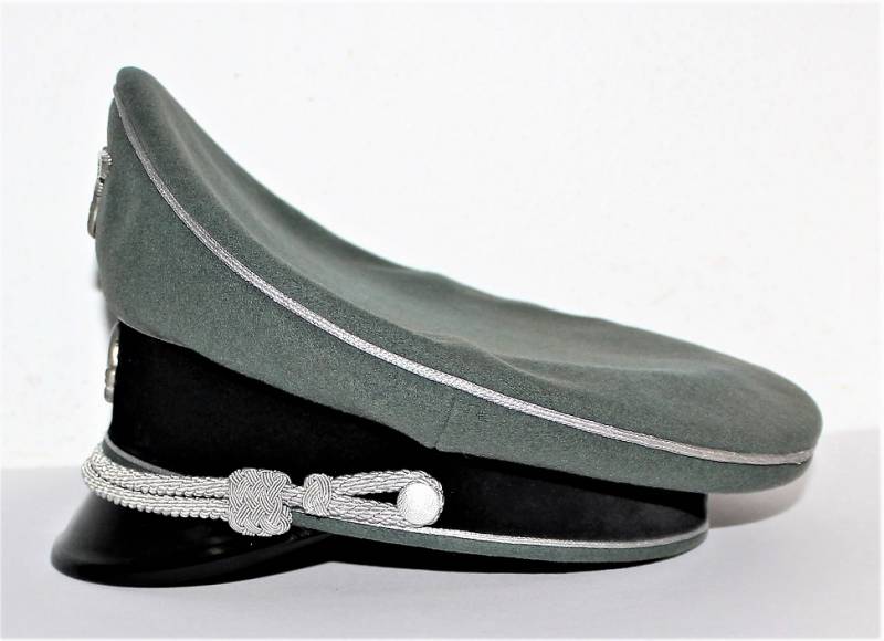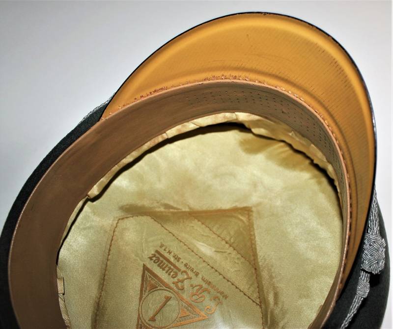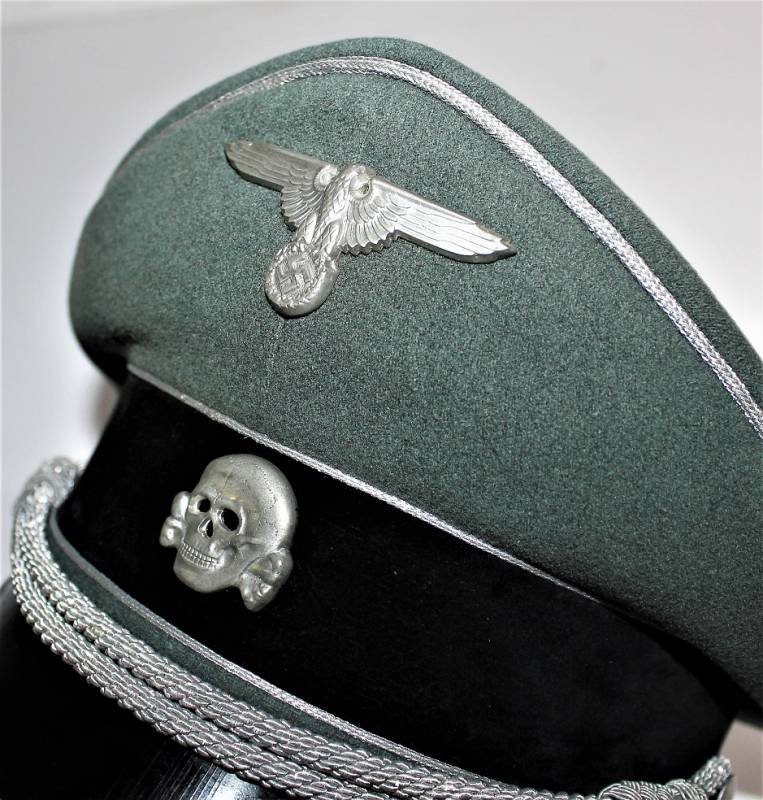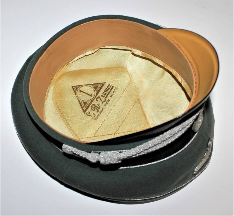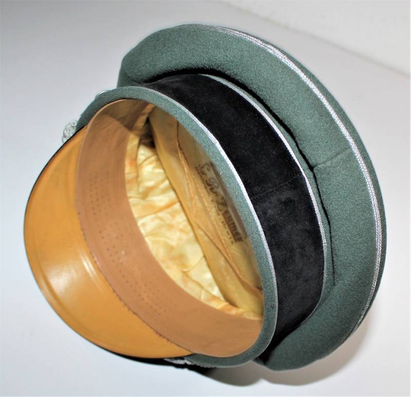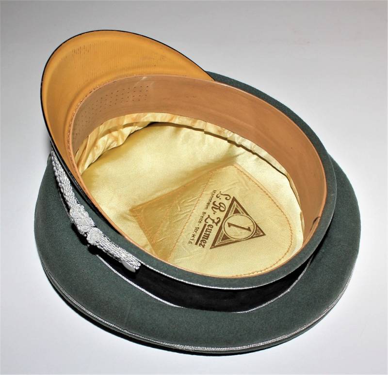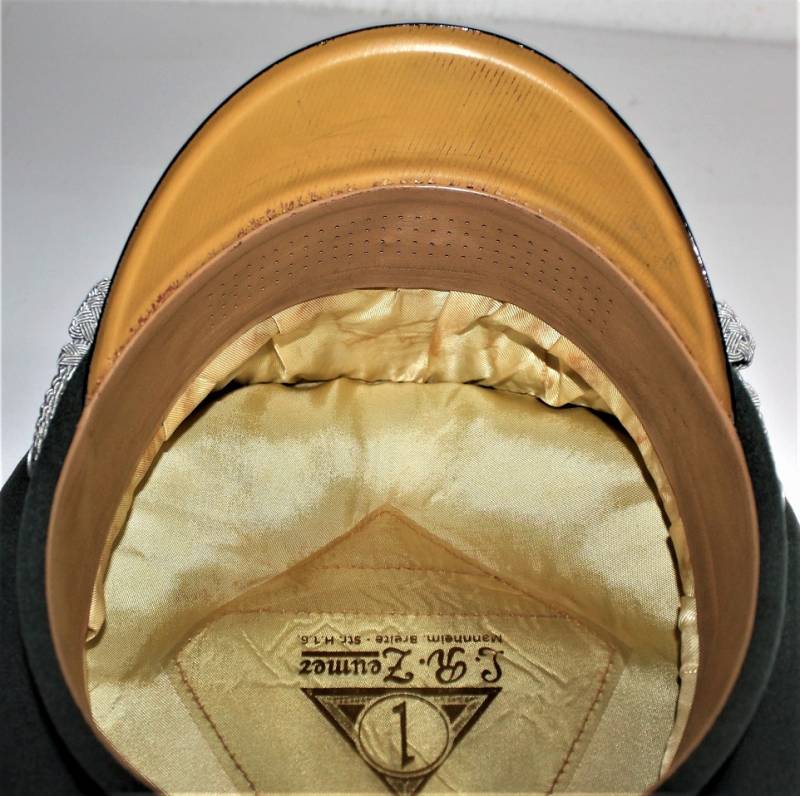 Superb and prestigious W.SS Generalīs schirmmutze visor cap in wonderful condition almost like new, used very little, born in elegant gray-green woolen cloth without holes or tears and with perfect stitching, beautiful silver insigna mounted in the period, interior complete with celluloid diamond not damage and intact and with manufacturerīs logo and name, leather sweat protector in perfect condition.