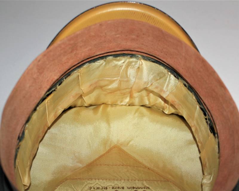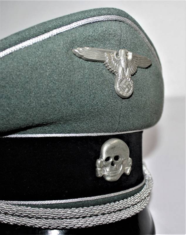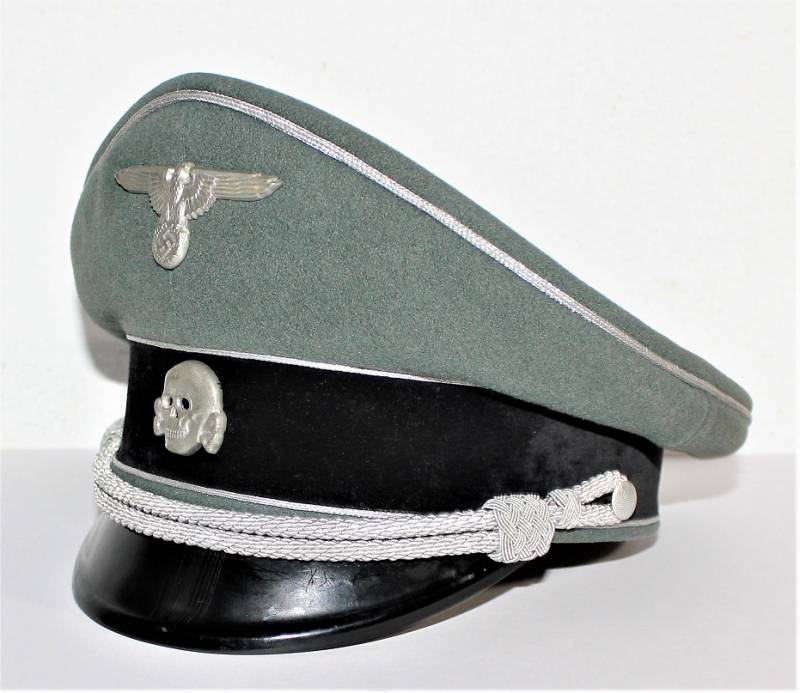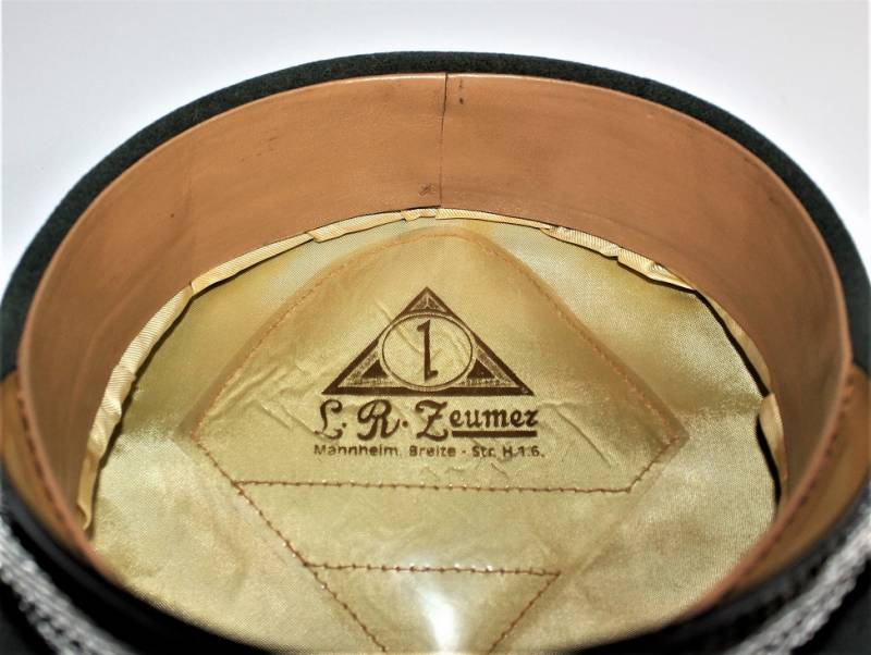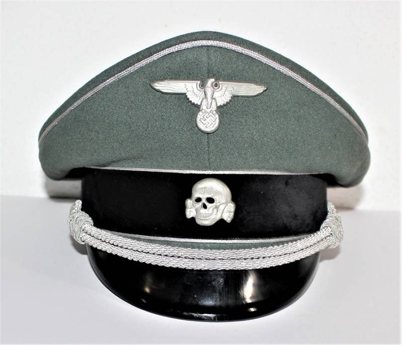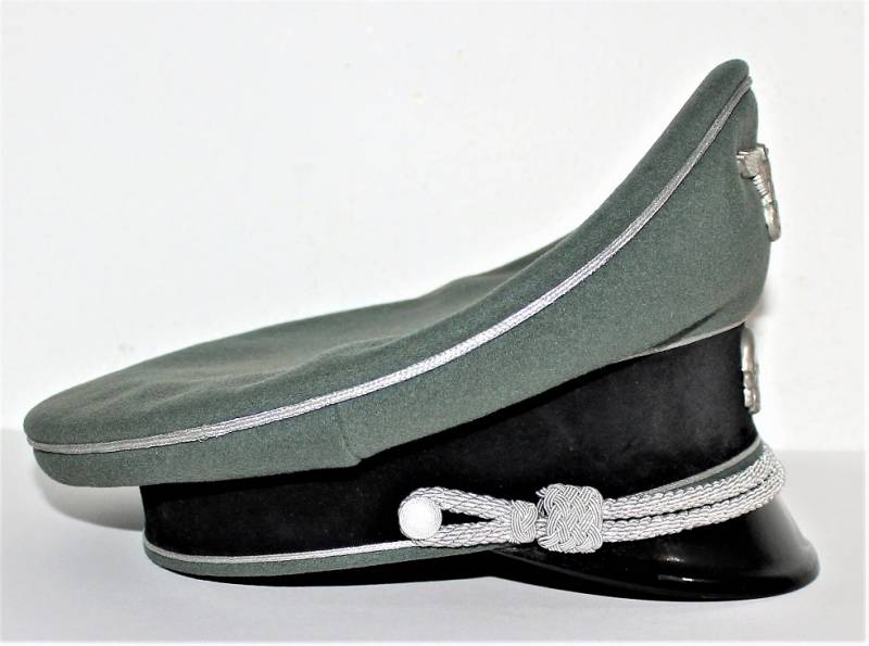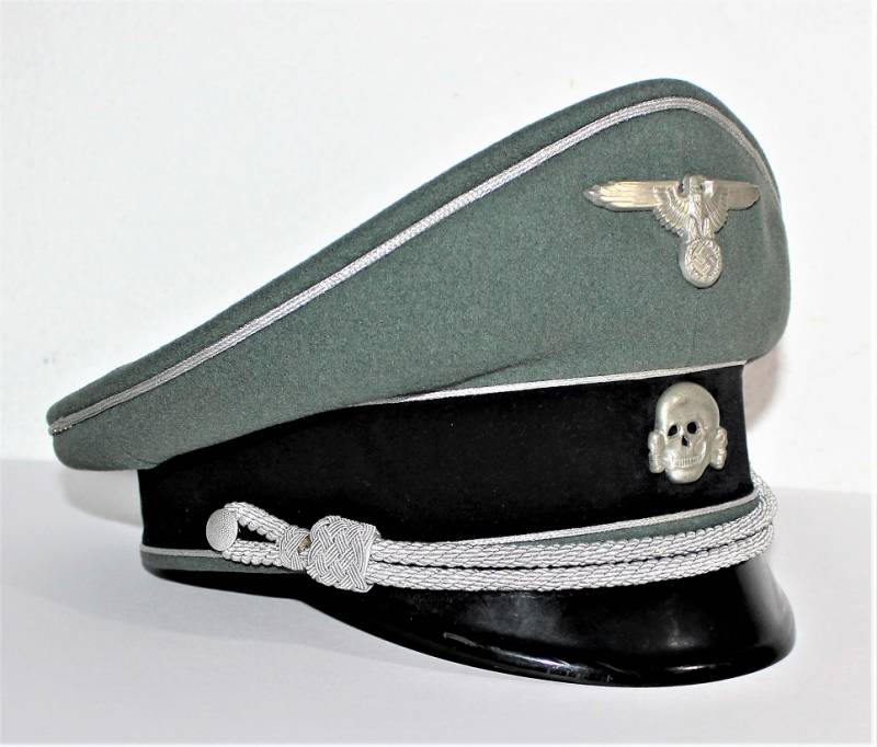 Superb and prestigious W.SS Generalīs schirmmutze visor cap in wonderful condition almost like new, used very little, born in elegant gray-green woolen cloth without holes or tears and with perfect stitching, beautiful silver insigna mounted in the period, interior complete with celluloid diamond not damage and intact and with manufacturerīs logo and name, leather sweat protector in perfect condition.