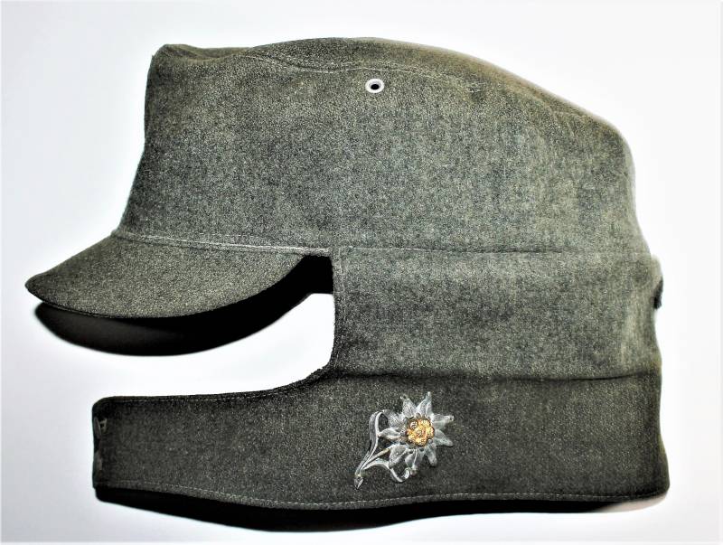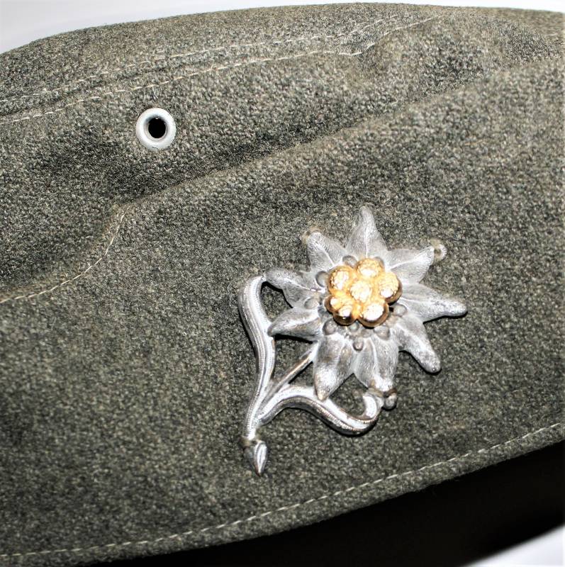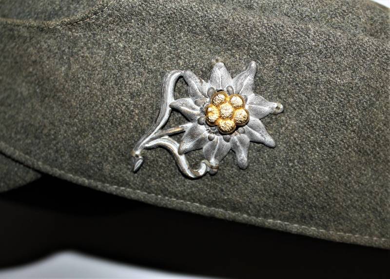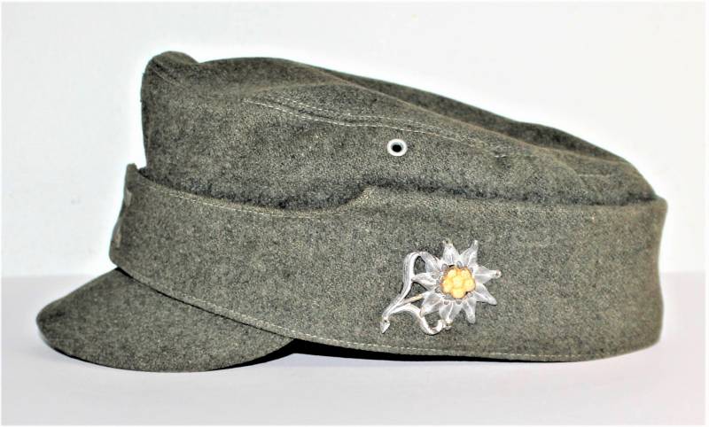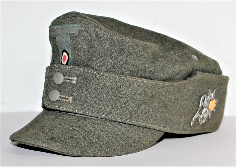 Field cap EM-NCO M41 Gebirgsjäger WH in excellent condition, complete in all its parts, not restored or repaired, without holes or tears, perfect stitching, regulatory insigna "T" mounted in the era and sewn by machine edelweiss mounted on the left side in the era, all only with a slight patina of time and use, regulatory construction for Gebirgsjäger cap.
