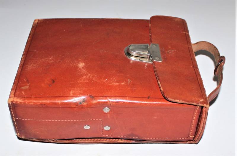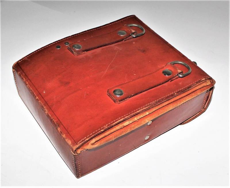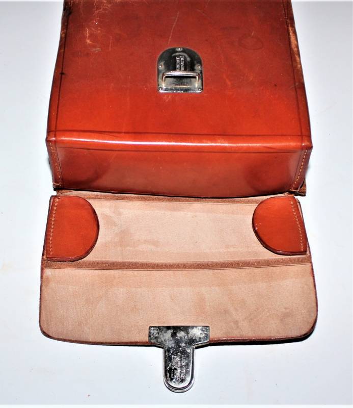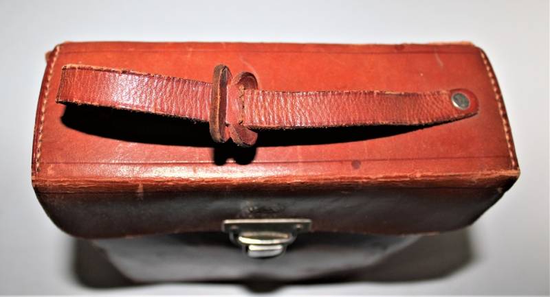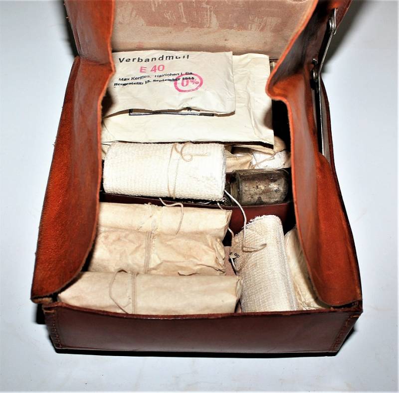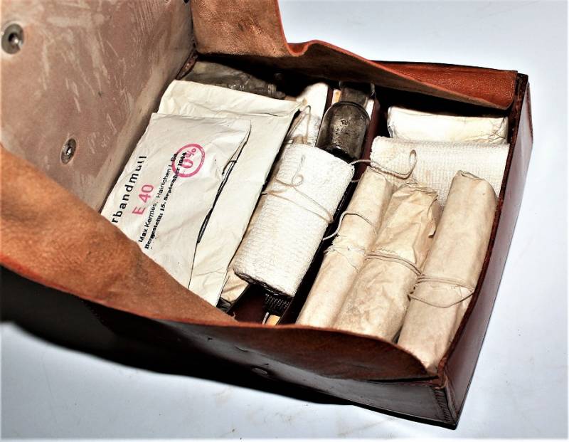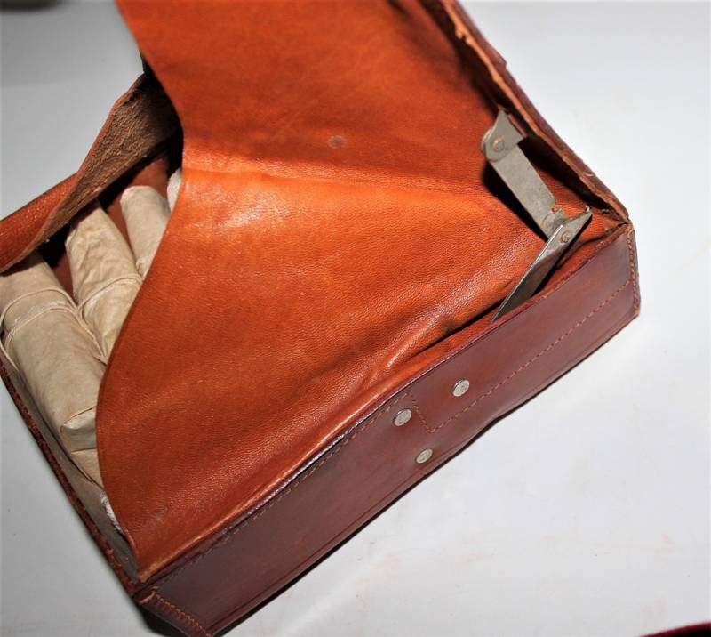 D.R.K. first aid medical kit, marked with acceptance marks of the departments of SA, born in brown leather, in excellent condition, perfect leather and seams, with light patina of time and use, internally complete with medication accessories. Original 100% WWII period.