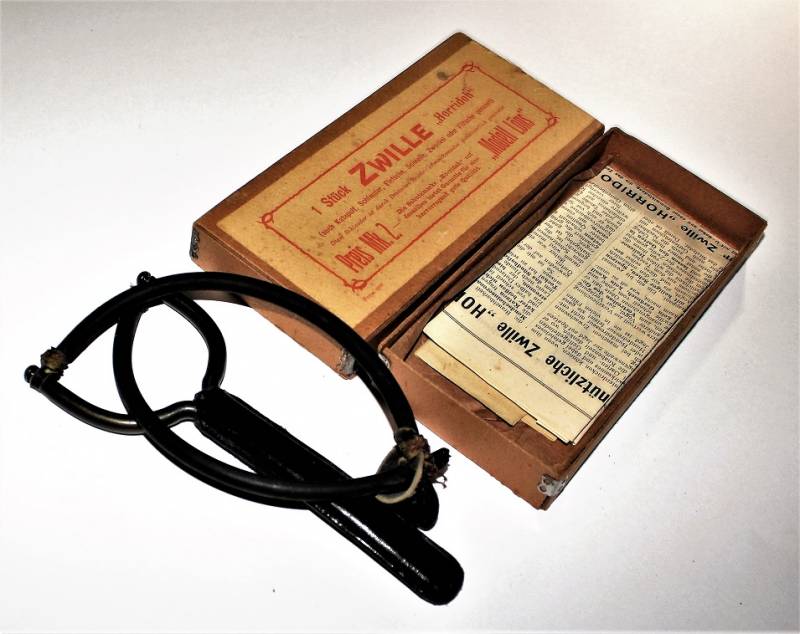 Rare metal slingshot complete with its original cardboard box with instruction manuals, excellent condition, almost like new, marked with manufacturer.