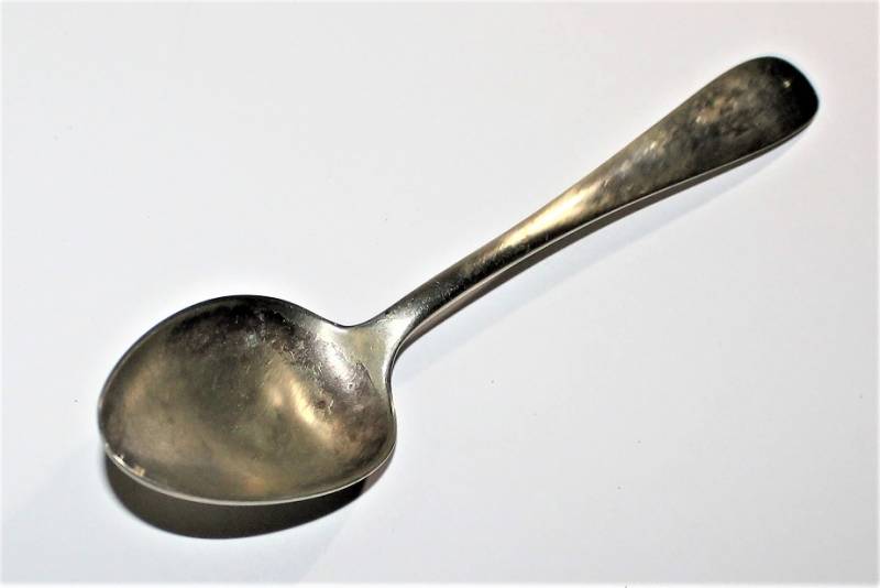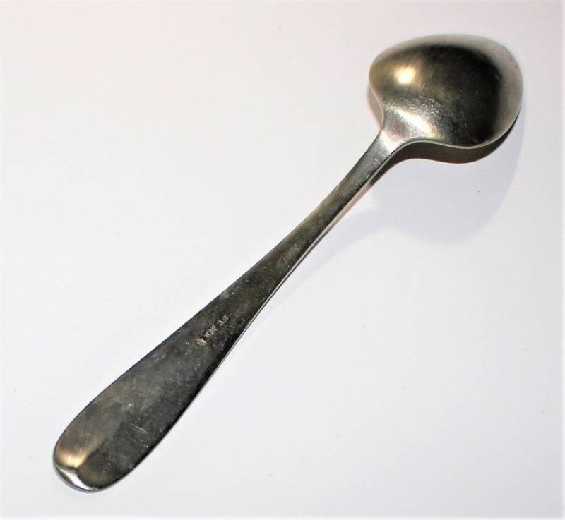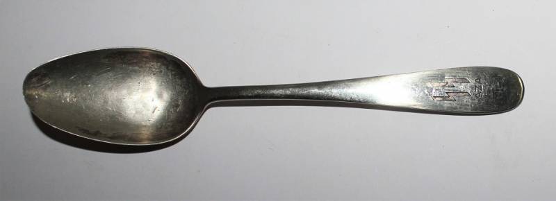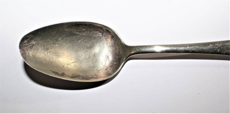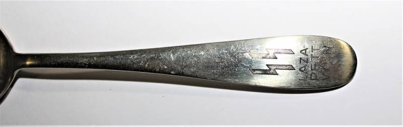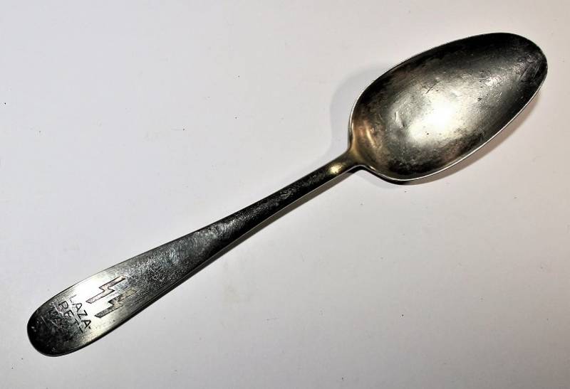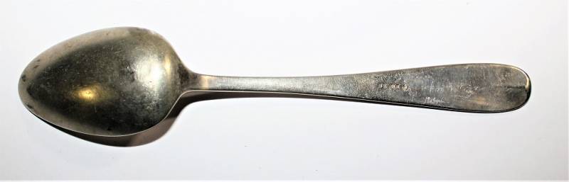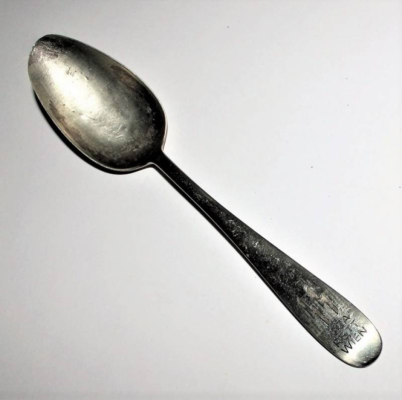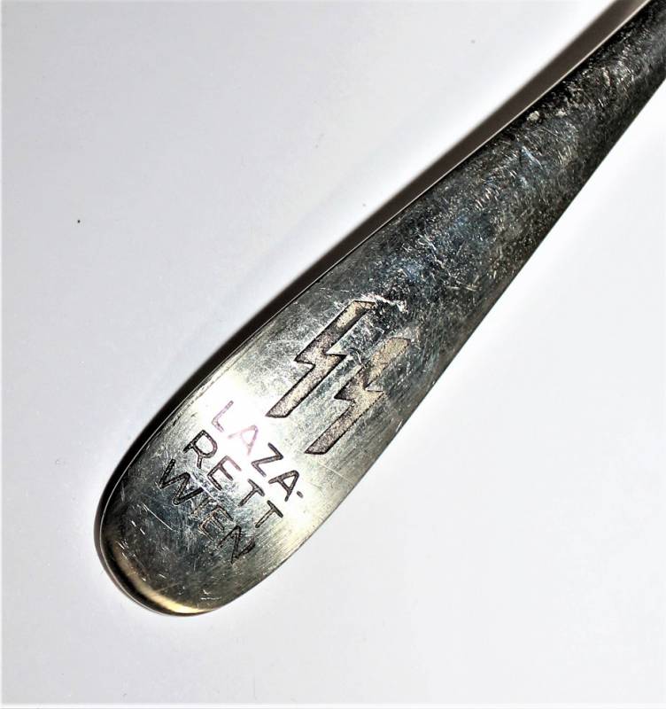 W.SS LAZARETT WIEN branded aluminum kitchen spoon in good condition, used with age patina. Dimensions length 21 cm.